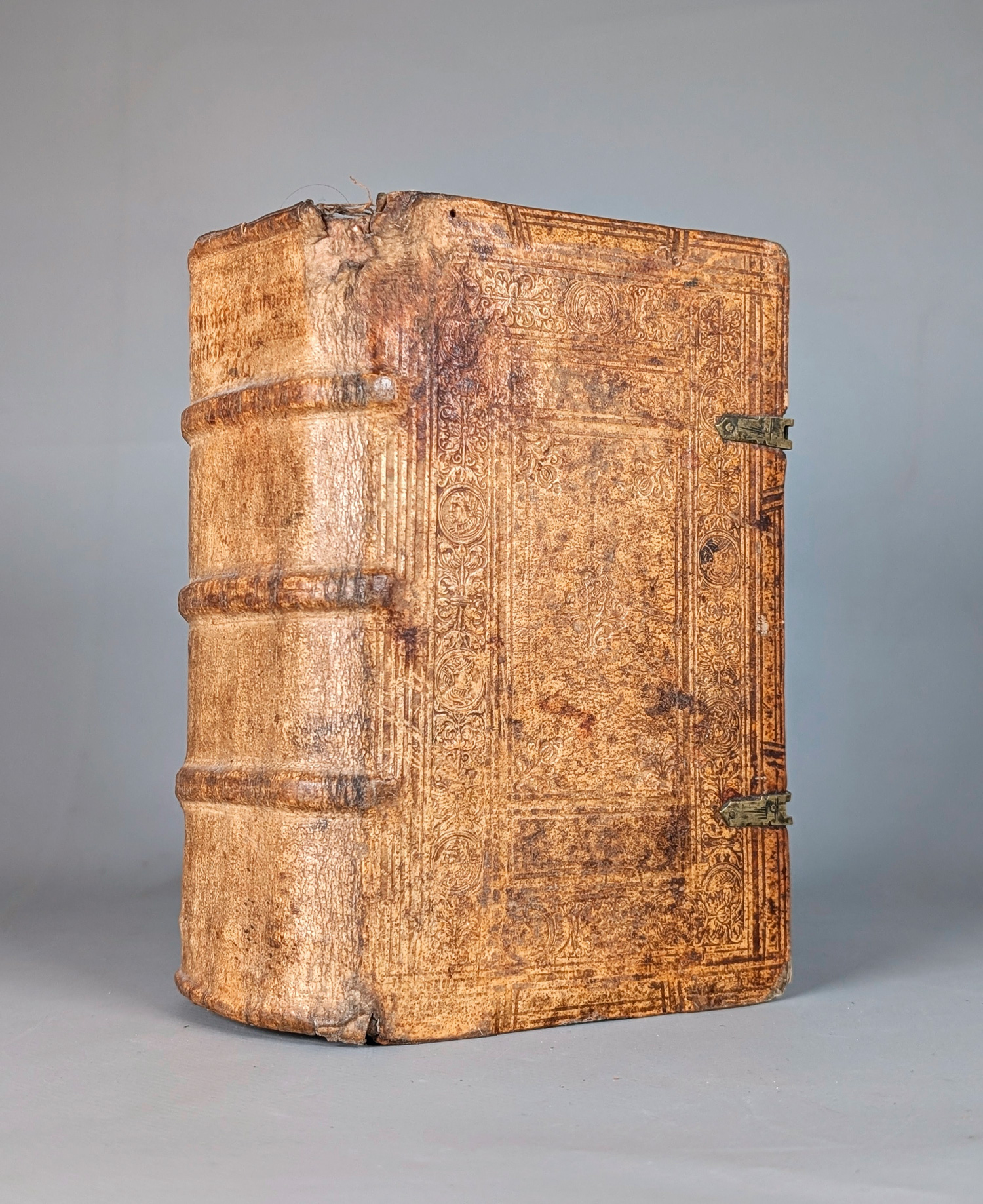 Grasser, Johann Jakob. Newe und volkommne Italianische, Frantzösische, und Englische Schatzkamer: Das ist: Wahrhaffte und eigendtliche Beschreibung aller Stätten in Italia, Sicilia, Sardinia, Corsica, Franckreich, Engelland, und darumb ligenden Provintzen. [Und:] Newe und volkommne Frantzösische und Englische Schatzkammer: Das ist: Wahrhaffte unnd eigendtliche Beschreibung, der zwey herrlichen und mechtigen Königreichen, Franckreich unnd Engelland. 2 Teile in 1 Band. 16 Bl., 1213 S., 9 Bl.; 8 Bl., 264 S. Mit 2 kleinen Holzschnitt-Druckermarke auf dem Titel und Wappenholzschnitt. 17 x 11 cm. Blindgeprägter Schweinslederband d. Z. (etwas stärker fleckig und berieben, oberes Kapital mit kleinerer Fehlstelle) mit 2 Messingschließen. Basel, Johann Jacob Genath bzw. Conrad Waldkirch, 1609-1610.