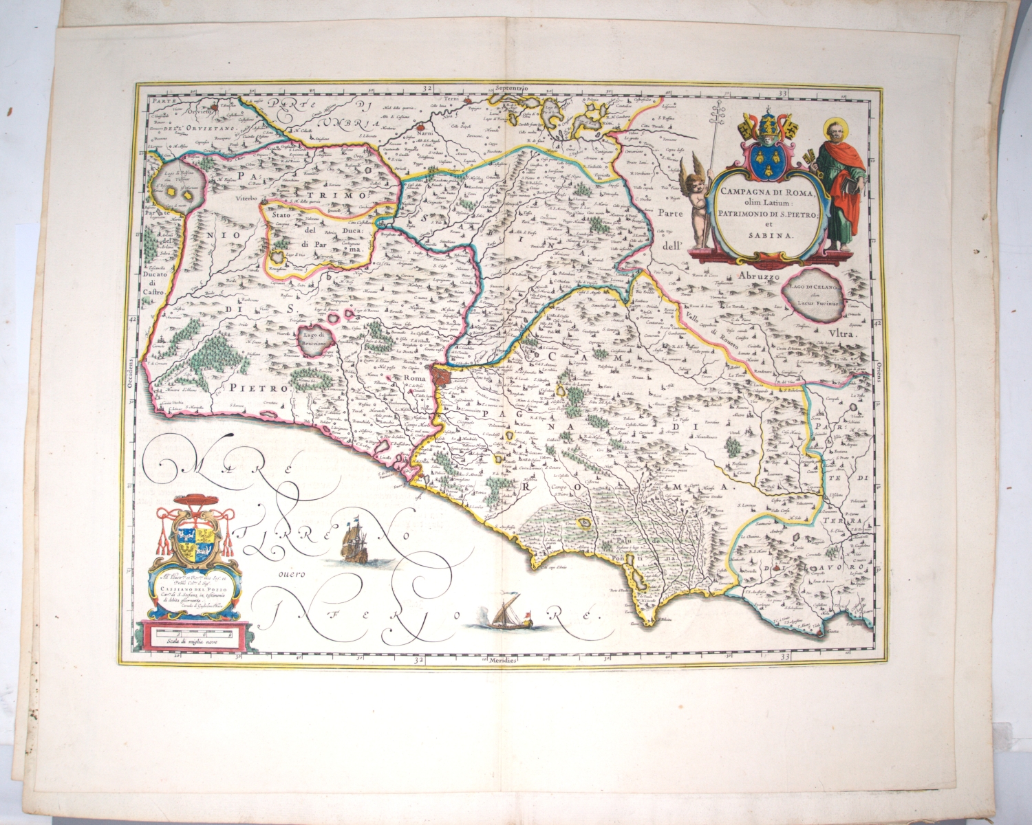 Vorhanden sind: I. Willem Janszoon Blaeu. Calabria Citra olim Magna Graecia. Grenzkoloriert. 1660. - II. Derselbe. Campagna di Roma, olim Latium. Patrimonio di S. Pietro et Sabina. Mit Grenzkolorit. Amsterdam 1640. - III. Derselbe. Calabria ultra olim altera magnae Graeciae pars. Mit Grenzkolorit. Amsterdam 1640. - IV. Derselbe. Terra di Lavoro, olim Campania Felix. Mit Grenzkolorit. Amsterdam, 1644. - V. Georg Braun und Franz Hogenberg. Calaris, Malta, Rhodus, Famaugusta. Köln 1574. - VI. Johann Baptist Homann. Sardiniae Regnum et Insula. Mit Flächenkolorit. Nürnberg 1734. - VII. Derselbe. Peloponesus hodie Moreae regnum. Mit Grenz- und Flächenkolorit. Nürnberg 1730. - VIII. Derselbe. Insula Corsicae accurata Chorographia Tradita. Mit Grenz- und Flächenkolorit. Nürnberg 1735. - IX. Henricus Hondius und Johannes Janssonius. Morea olim Peloponnesus. Koloriert. Amsterdam 1636.