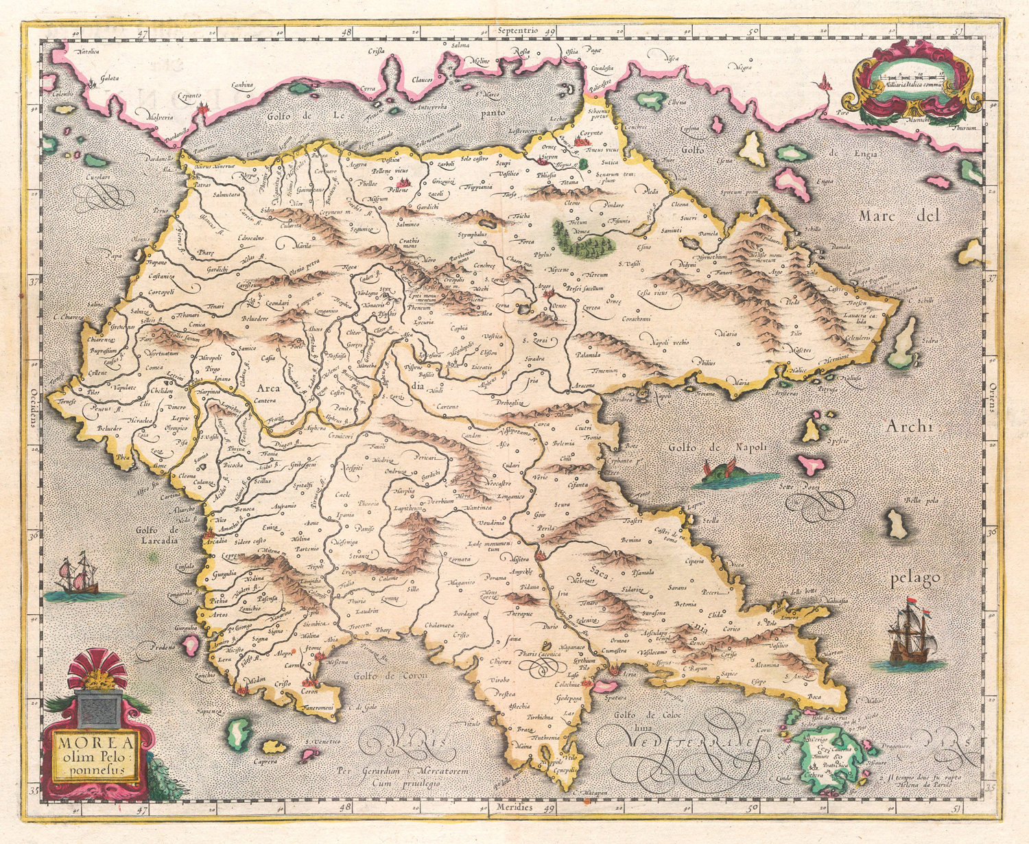 Griechenland. Konvolut von 9 teils kolorierten Kupferkarten. 33 x 47 cm (Plattenrand) bis 49,5 x 59 cm (Plattenrand). Meist Amsterdam oder Nürnberg 1574-1735.