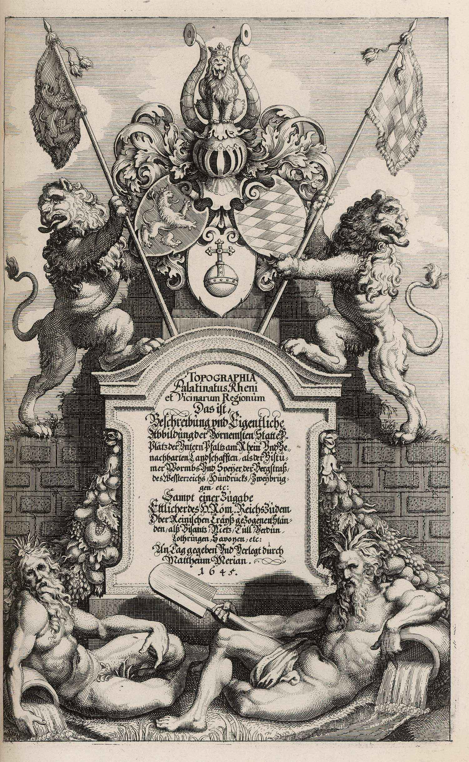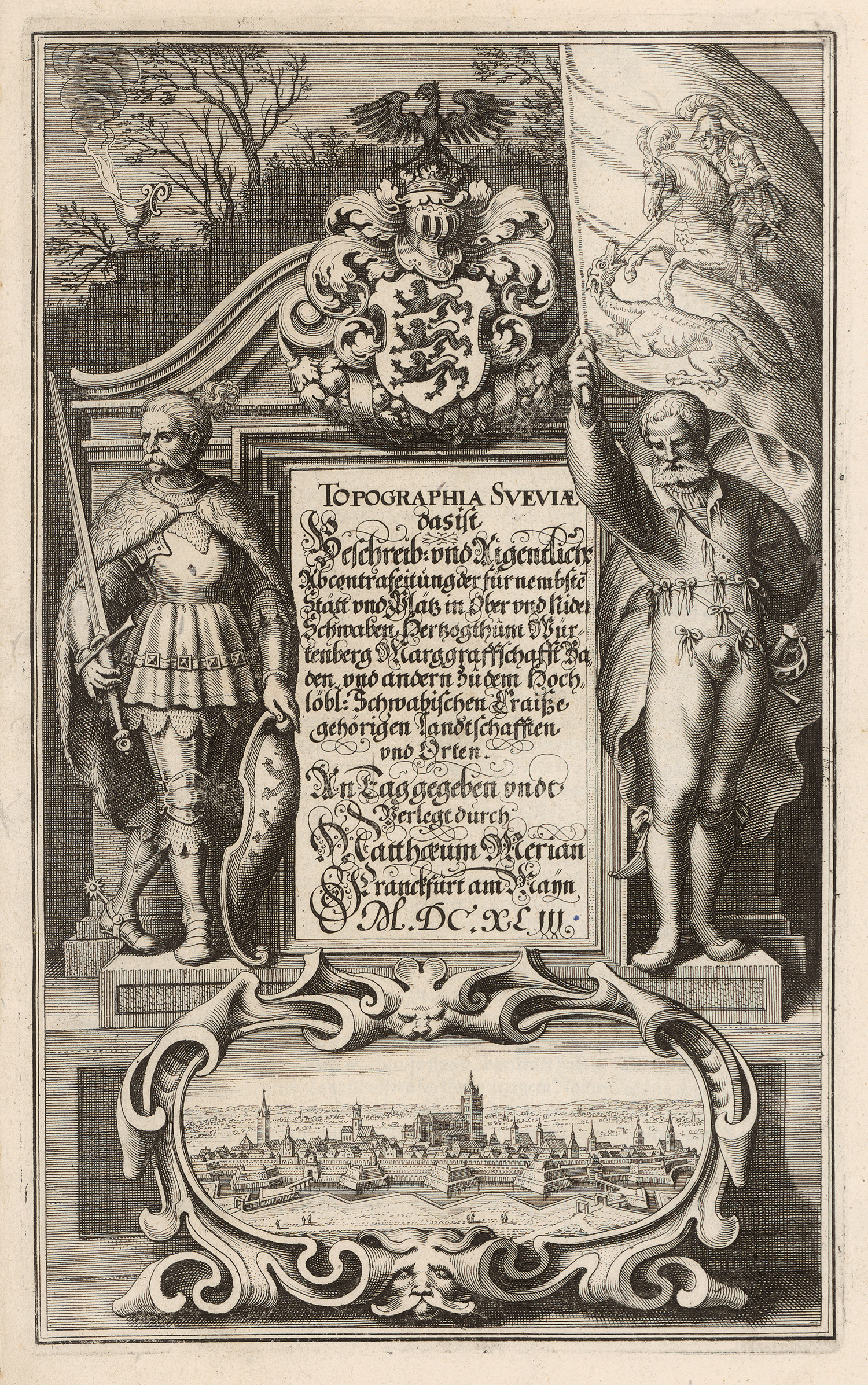 Wüthrich 11. – Erste Ausgabe. Eine der frühesten deutschen Topographien von Merian, noch vor dem Ende des Dreißigjährigen Krieges entstanden. Vorhanden sind : I. Topographia Sveviae, das ist Beschreib- und aigentliche Abcontrafeitung der fürnembsten Stätt und Plätz in Ober und Nider Schwaben, Herzogthum Würtenberg, Marggraffschafft Baden. - II. Topographia Alsatiae, completa . Das ist vollkömmliche Beschreibung und Eigentliche Abbildung der vornehmsten Städte und Oerter im Obern- und Unter-Elsaß ... - II. Topographia Palatinaturs Rheni et vicinarum regionum. Das ist Beschreibung und eigentliche Abbildung der vornemsten statte und Plätze Intern Pfalz am Rhein und benachbarten Landschaften ... – Vorderes Innengelenk teils offen, vereinzelt leicht fleckig, sonst gutes Exemplar.