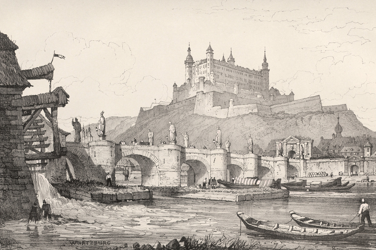 Schmitt 190. Nicht bei Abbey. – Bemerkenswert schöne, sehr suggestive Veduten in malerischer Manier auf den Stein gebracht von dem englischer Maler, Zeichner und Lithograph Samuel Prout (1783-1852). Das Prachtalbum enthält Ansichten der wichtigsten Städte und Monumente aus Deutschland und Belgien, darunter 32 deutsche Ansichten wie Andernach, Augsburg, Bamberg (2), Braunschweig, Dresden (5), Frankfurt (2), Godesberg, Heidelberg, Koblenz, Köln (4), Mainz (2), München, Nürnberg (2), Regensburg (3), Ulm, Würzburg (2) u.a. Ferner Ansichten aus Antwerpen, Basel, Brügge, Brüssel, Gent, Lüttich, Malines (2), Prag (5), Straßburg (2) etc. – Ohne das meist fehlende Subskribentenverzeichnis, nur ganz vereinzelt und unwesentlich fleckig, alle Tafeln mit ihren originalen Seidenhemdchen, fast durchgehend in sehr schöner, sauberer Erhaltung und in bestem lithographischen Druck.