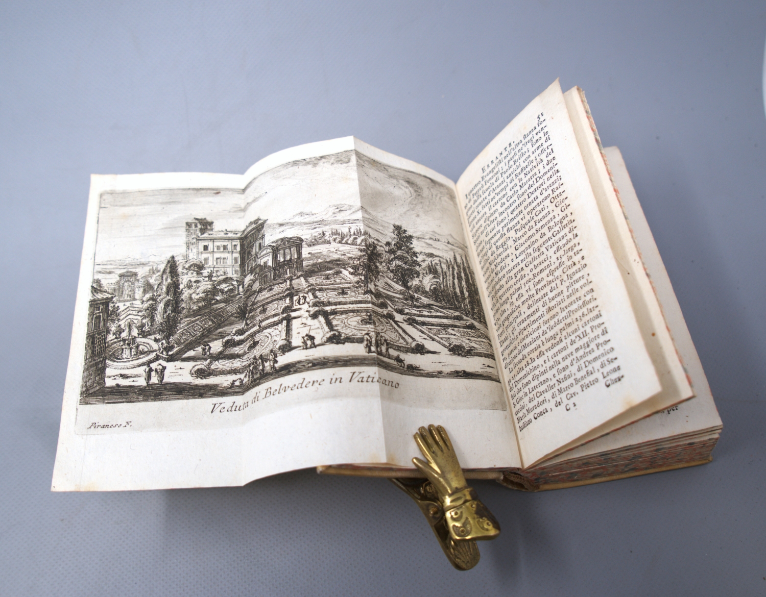 Rossini, Pietro. Il mercurio errante delle grandezze di Roma. Ottava edizione migliorato. 2 Teile in 1 Band. 6 Bl., 236 S.; 1 Bl., S, 237-418. Mit 18 Faltkupfern von G. B. Piranesi, J. L. Le Geay und F. P. Duflos. 15,5 x 8,5 cm. Pergament d. Z. (Deckel schwach geworfen). Rom, Generoso Salomoni für Fausto Amidei, 1760.