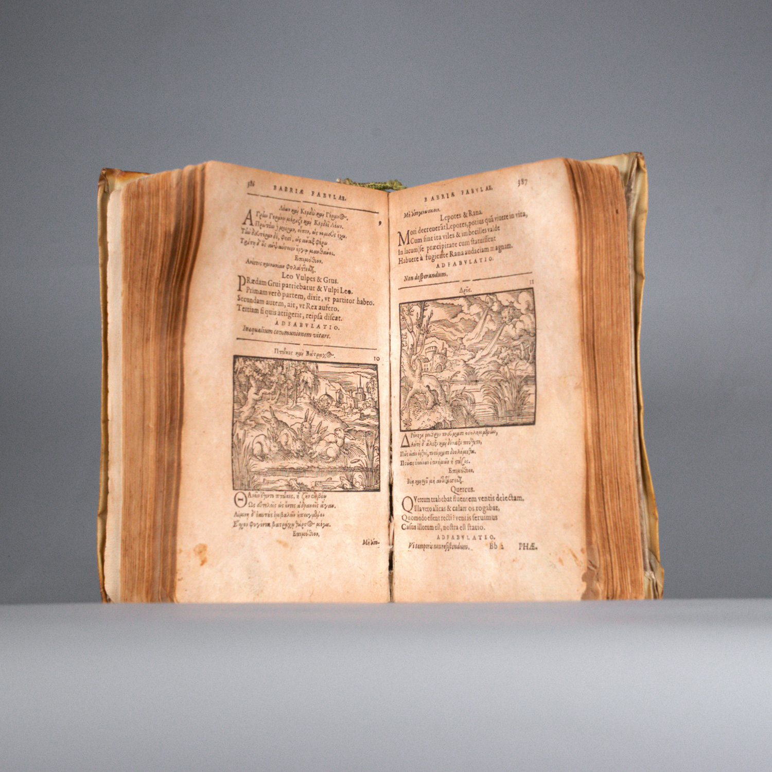 Aesop. Fabulae variorum auctorum nempe Aesopi fabulae Graeco-Latinae CCXCVII. Aphthonii Soph. Fabulae Gr. Lat. XL. Gabriae Fab. Gr. Lat. XLIII. Babriae Fab. Gr. Lat. XI. Opera & studio Isaaci Nicolai Nevelet. 8 Bl., 678 S. Mit 237 Textholzschnitten von Virgil Solis. 16 x 9,5 cm. Pergament d. Z. (stärker fleckig und berieben, Einband vom Block gelöst). Frankfurt, Gerlach und Beckenstein, 1660.
