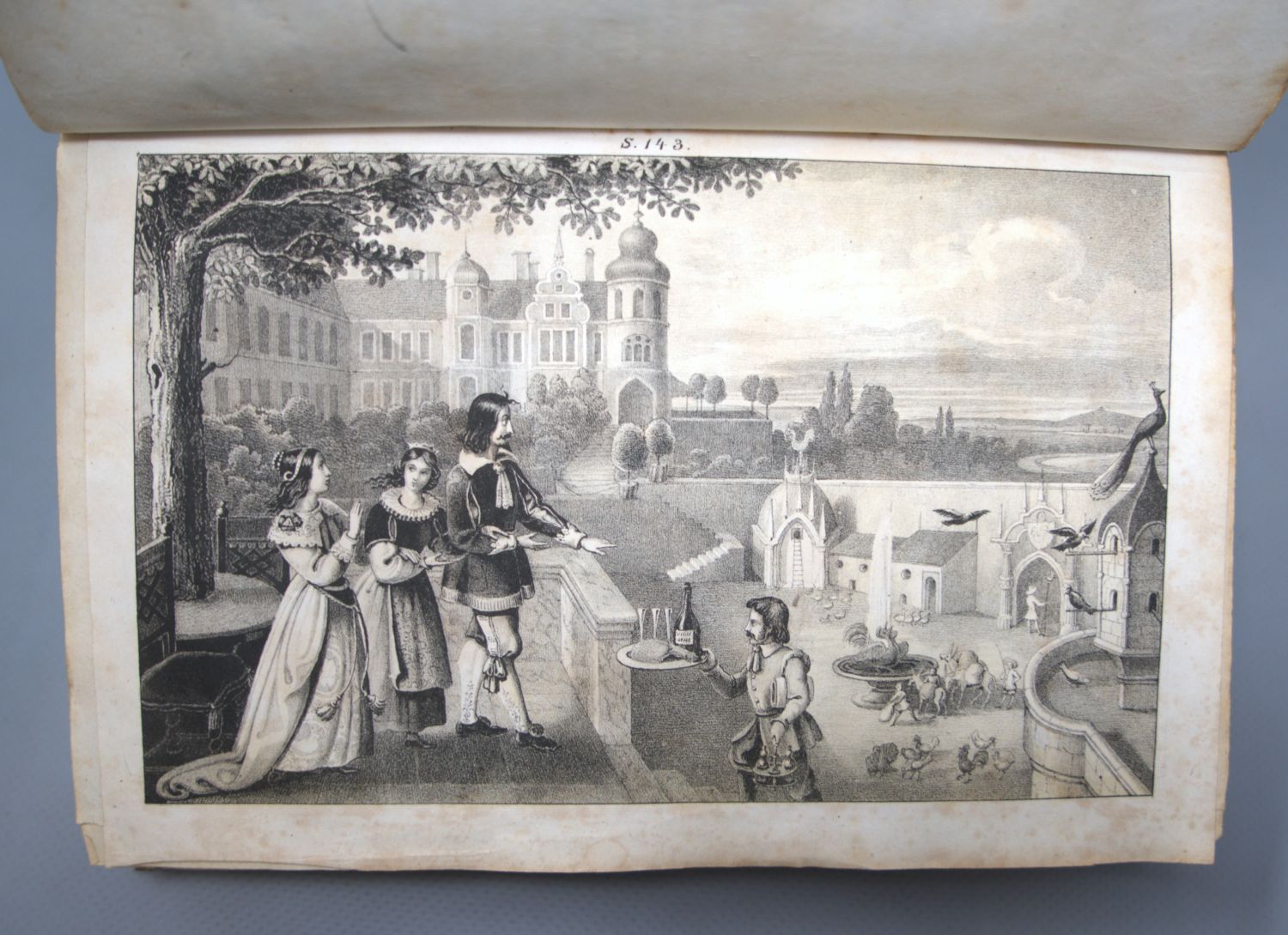Brentano, Clemens. Gockel, Hinkel und Gackeleia, ein Mährchen. XIV, 346 S. Mit lithographischem Titel und 14 getönten lithographischen Tafeln nach Brentanos Angaben und Entwürfen. 2,5 x 14 cm. Roter Halblederband d. Z. (berieben und bestoßen, obereres Kapital mit Einriss, Rückenbezug mit 3 Löchern; mit montiertem typographischem ORückumschlag ) mit RVergoldung und goldgeprägtem RTitel. Frankfurt, Schmerber, 1838.