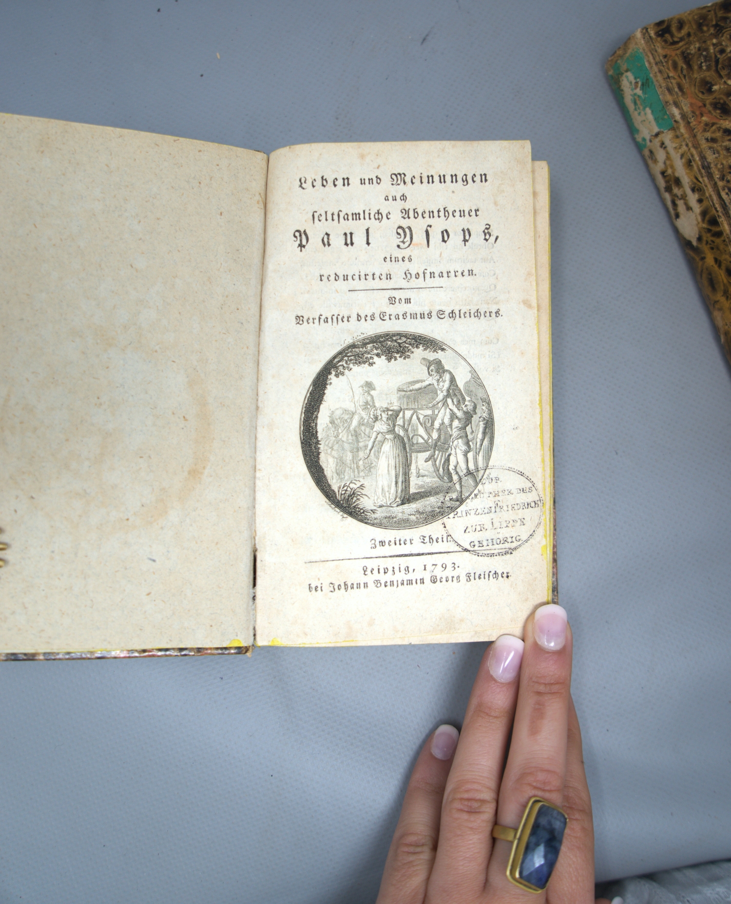 Goedeke V, 509, 10. Hayn-Gotendorf I, 692. – Erste Ausgabe des Schelmenromans. Carl Gottlob Cramers Werk war zu seiner Zeit außerordentlich erfolgreich und beliebt, "jetzt verschollen und vergessen. Indessen bildeten alle diese abenteuerlichen Geschichten mit ihren naiven Gemeinheiten, ihrer alten ehrlichen Grobheit, ihrer Frivolität und unverschleierten Wollust, nicht minder mit ihrem Pferdegetrapp, ihren Lanzensplittern, fallenden Burgen, Rittern und Jungfrauen, verbunden mit den großartigsten Flüchen und anderweitigen colossalen Redensarten, ein natürliches und notwendiges Gegengift gegen die Sentimentalität des letzten Viertels des vorigen und des ersten Decenniums dieses Jahrhunderts" (ADB IV, 558, ausführlich). Mit der häufig fehlenden Musikbeilage zu Ysops Leiblied "Wollt ihr wissen wer ich bin? ich bin ein dummer Schwabe!" – Etwas fleckig, Titel alt gestempelt, Musikbeilage verso teils alt hinterlegt, Block etwas verschoben. Mit Exlibris Viktor Achter. – Dabei: Derselbe. Ysopiana. Als Anhang und Nachtrag zu dem Leben Paul Ysops eines reducirten Hofnarren. 238 S. Mit koloriertem gestochenem Frontispiz. 16 x 9,5 cm. Etwas späterer Pappband (berieben). Ebenda 1799. - Goedeke V, 510, 28. - Erste Ausgabe. - Titel und weißes Schlussblatt mit Papierausschnitt.