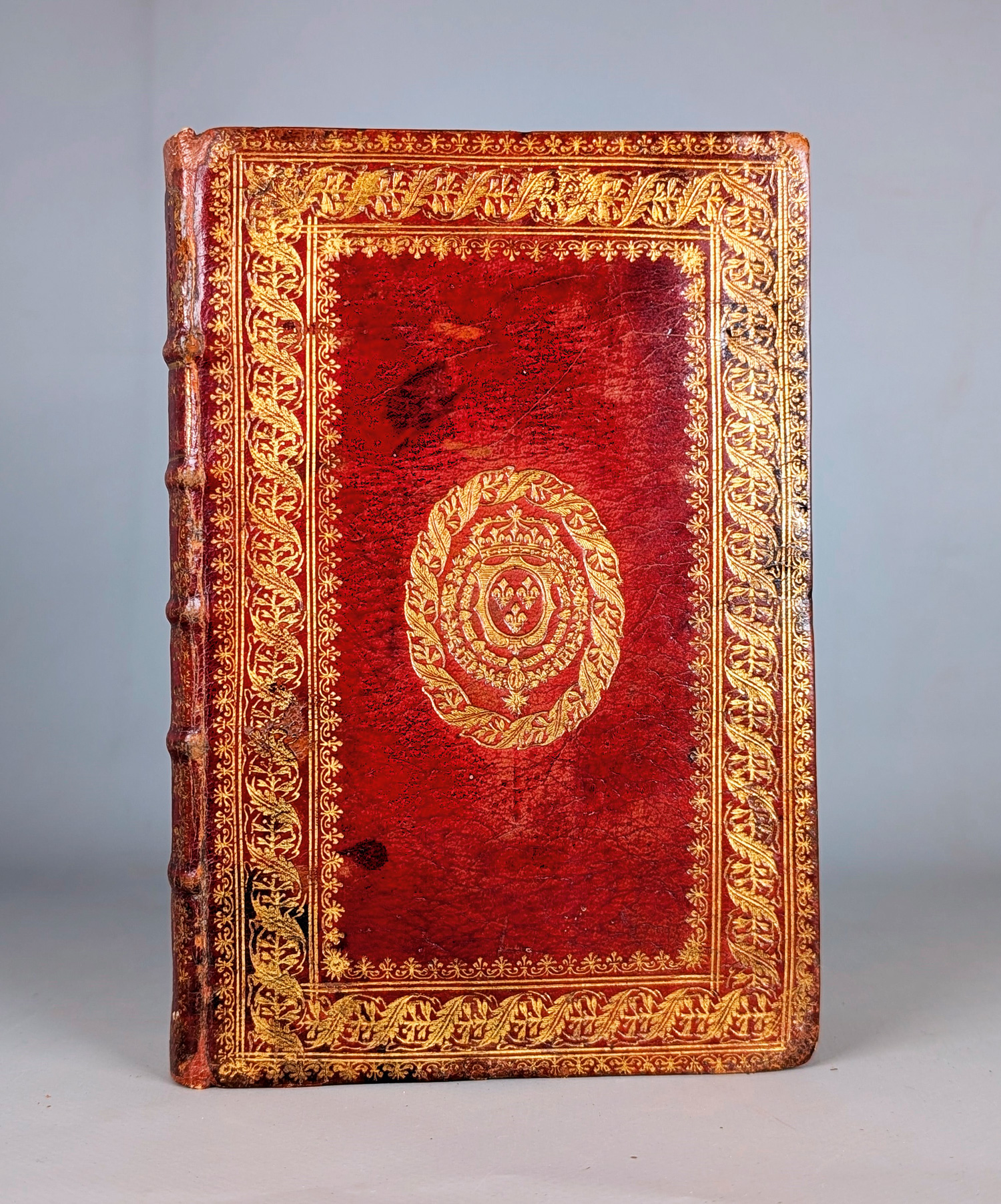 Prächtiger Oktavband aus der Bibliothek des Sonnenkönigs Ludwig XIV., mit entsprechendem Wappensupralibros des französischen Königshauses (drei Bourbonenlilien unter einer Krone mit umgebendem Ährenkranz) auf beiden Deckeln. Mit reicher Rückenvergoldung, sehr breiter ornamentaler Deckelbordüre, Innen- und Stehkantenbordüre sowie Goldschnitt. Inhalt: Jean Duvergier de Hauranne. Instructions Chrestiennes. Herausgegeben von Arnauld d'Andilly. 2 Teile in 1 Band (mit durchgehender Paginierung). 12 Bl., 374 S., 8 Bl. Mit gestochener Titelvignette. Paris, Pierre le Petit, 1672. - Titel mit königlichem Wappen- sowie entsprechendem Veräußerungsstempel. – Kapitale fachmännisch restauriert, sonst nur etwas berieben und leicht bestoßen.