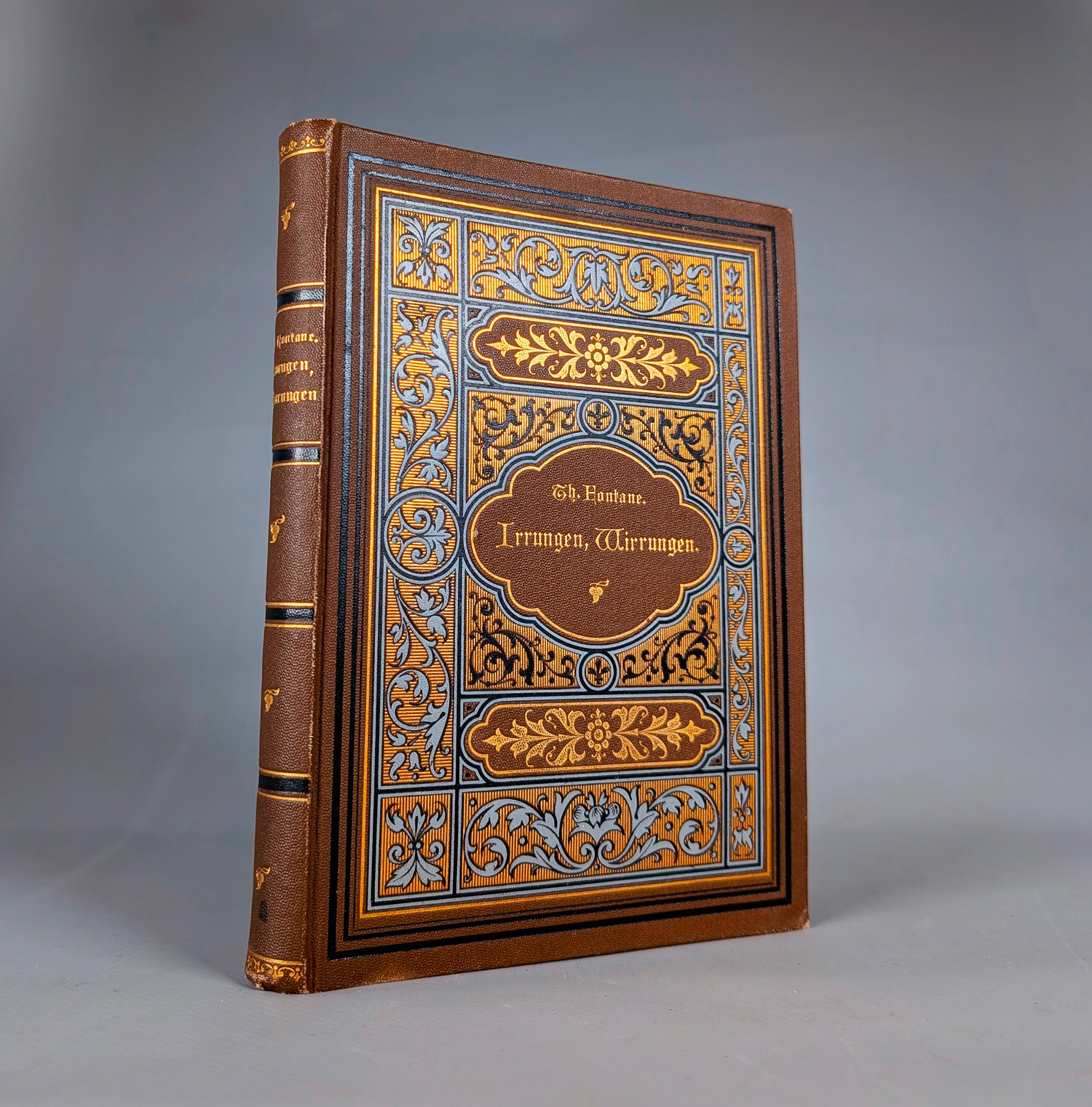 Fontane, Theodor. Irrungen, Wirrungen. Roman. 2 Bl., 284 S. 18 x 12,5 cm. Brauner OLeinenband (minimal berieben) mit Schwarz-, Gold- und Blauprägung. Leipzig, F. W. Steffens (1888).