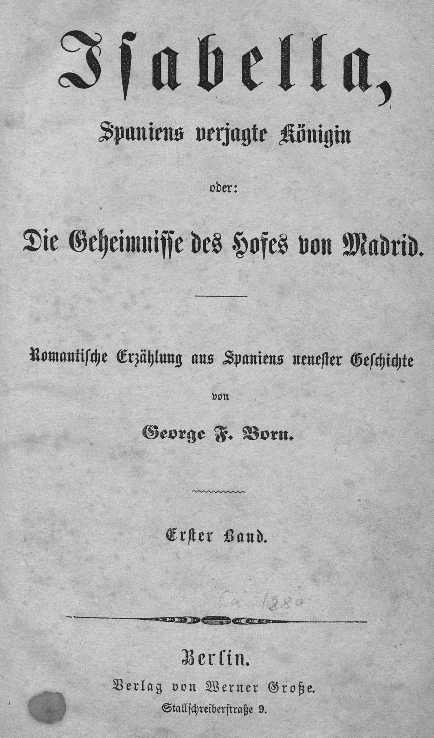 Kolportage. - Born, George F. (d. i. Georg Füllborn). Isabella, Spaniens verjagte Königin oder: Die Geheimnisse des Hofes von Madrid. Romantische Erzählung aus Spaniens neuester Geschichte. 1440 S. 20 x 12,5 cm. Moderner Pappband. Berlin, Werner Große, (um 1870).