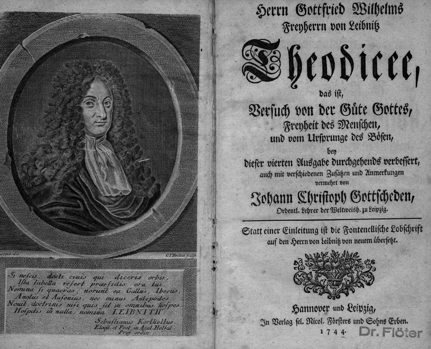 Leibniz, Gottfried Wilhelm. Theodicee, das ist, Versuch von der Güte Gottes, Freyheit des Menschen, und vom Ursprunge des Bösen, bey dieser vierten Ausgabe durchgehends verbessert, auch mit verschiedenen Zusätzen und Anmerkungen vermehrt von Johann Christoph Gottsched. 12 Bl., 64, 843 S., 25 Bl. Mit gestochenem Portrait und gestochenem Faltkupfer. 18 x 11,5 cm. Schlichter etwas späterer Interims-Pappband (stärker fleckig und beschabt, mit hs. RTitel). Hannover und Leipzig, Erben Nicolaus Förster, 1744.