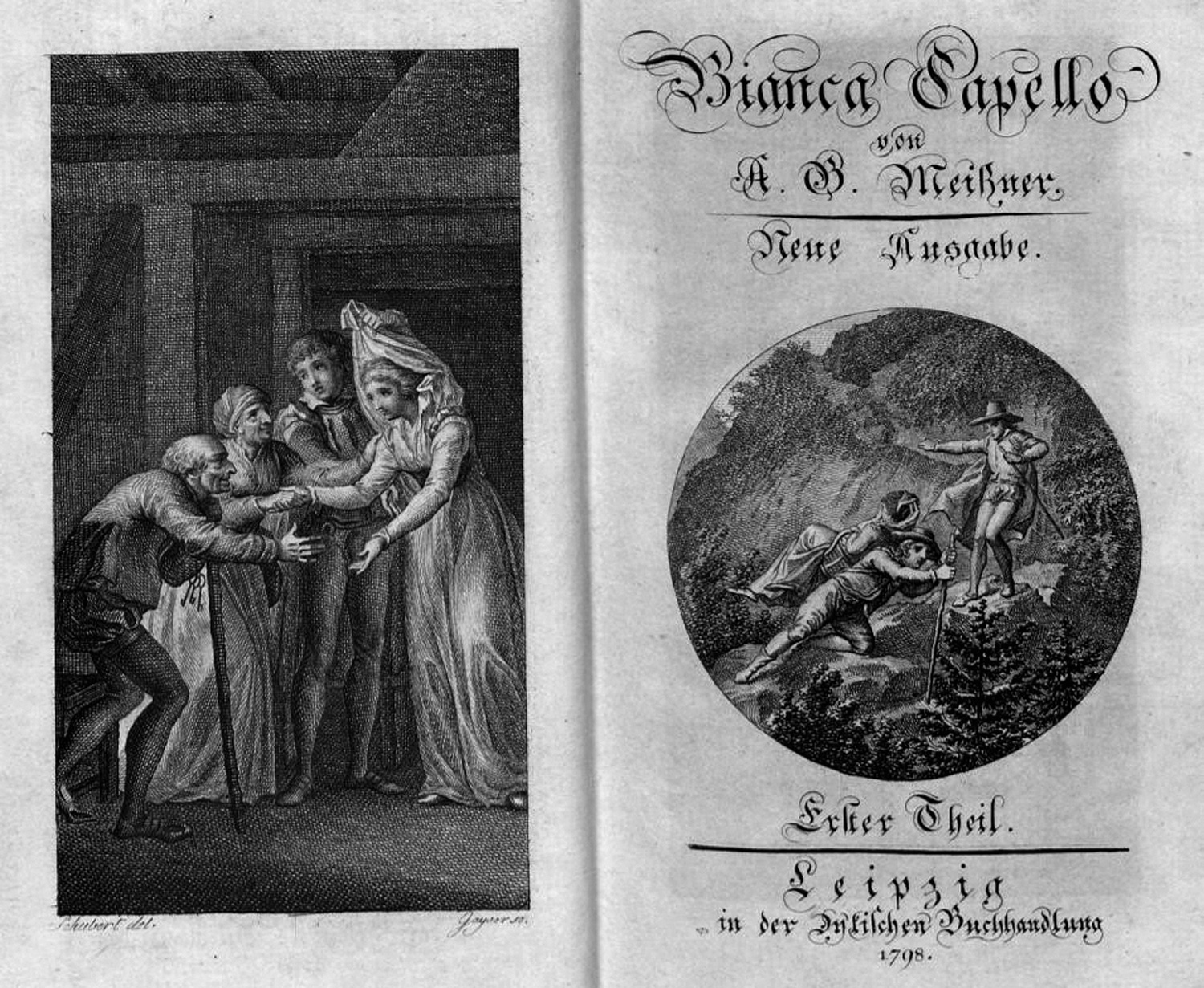 Meißner, A(ugust) G(ottlieb). Bianca Capello. Neue Ausgabe. 2 Bände. 390 S., 1 w. Bl.; 342 S., 1 w. Bl. Mit 2 gestochenen Titeln mit Vignette und 2 gestochenen Frontispices von Geyser nach Schubert. 18 x 10,5 cm. Halbleder d. Z. (etwas fleckig) mit dezenter RVergoldung und goldgeprägten RSchildern. Leipzig, Dyk, 1798.