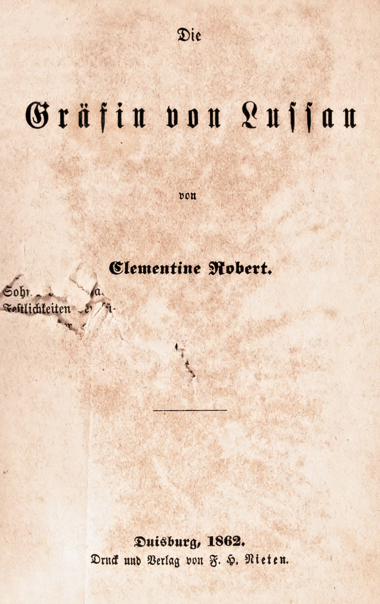Robert, Clementine. Die Gräfin von Lussan. S 3-215. 15 x 11 cm. Blindgeprägter Leinenband d. Z. (berieben, Ecken bestoßen, Rücken mit Einriss am oberen Kapital) mit goldgeprägtem RTitel. Duisburg, F. H. Nieten, 1862.