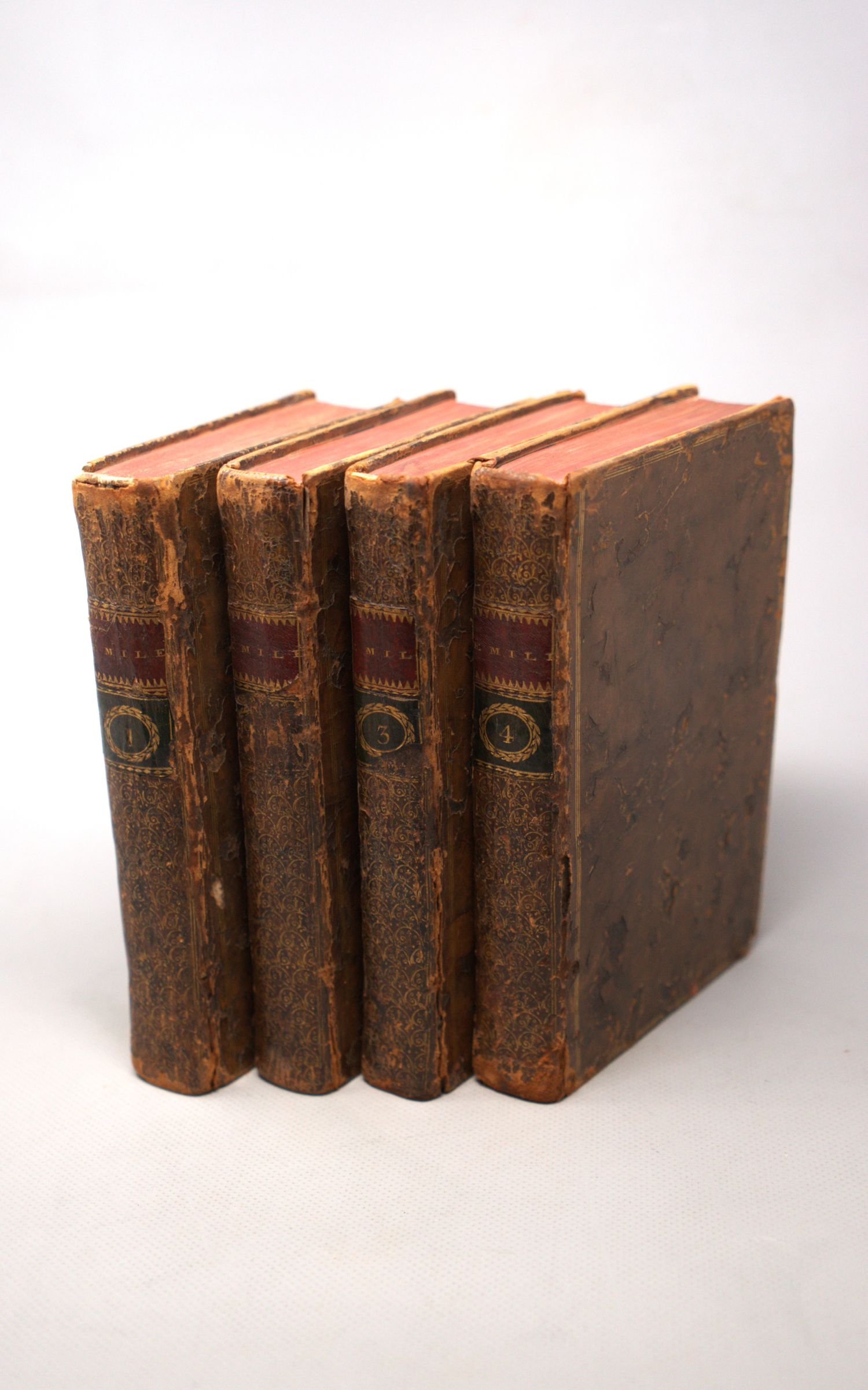 Rousseau, Jean-Jacques. Émile, ou de l'éducation. 4 Bände. Titel in Rot und Schwarz. Mit 5 Kupfertafeln nach Eisen. 19 x 12,5 cm. Marmorierte Kalbslederbände d. Z. (etwas beschabt und berieben) mit ornamentaler RVergoldung, je 2 goldgeprägten RSchildern (Band II fehlt eines) und dreifachen Deckelfileten. "A La Haye, Chez Jean Néaulme" (d. i. Paris, Duchsene), 1762.