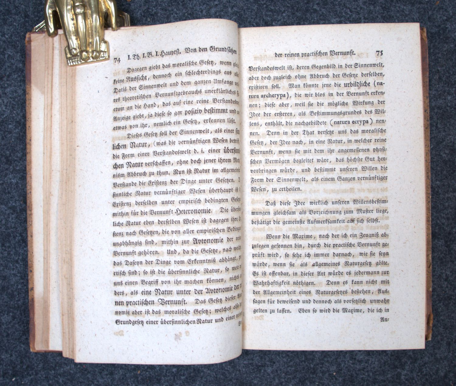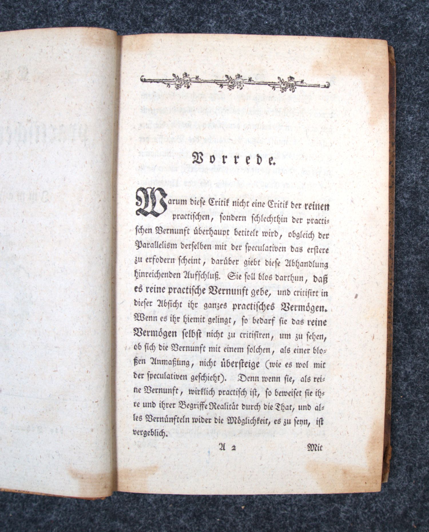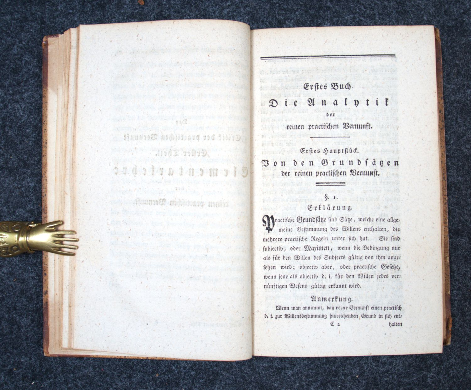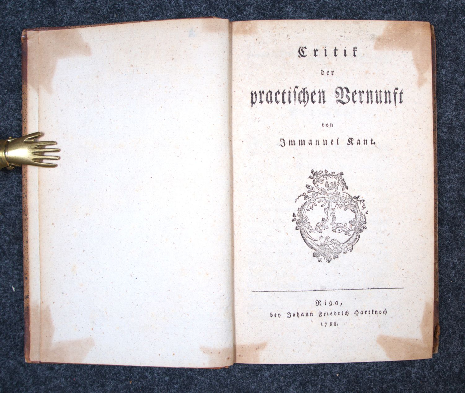 Warda 112. Adickes 67. – Erste Ausgabe von Kants zweiter Kritik, die seine Theorie der Moralbegründung enthält. Bis heute eines der wichtigsten Werke der Praktischen Philosophie überhaupt. Mit dem kategorischen Imperativ: "Handle so, daß die Maxime deines Willens jederzeit zugleich als Prinzip einer allgemeinen Gesetzgebung gelten könne." – Etwas stärker leimschattig, sonst schön und wohlerhalten. Innenspiegel mit altem Besitzeintrag.