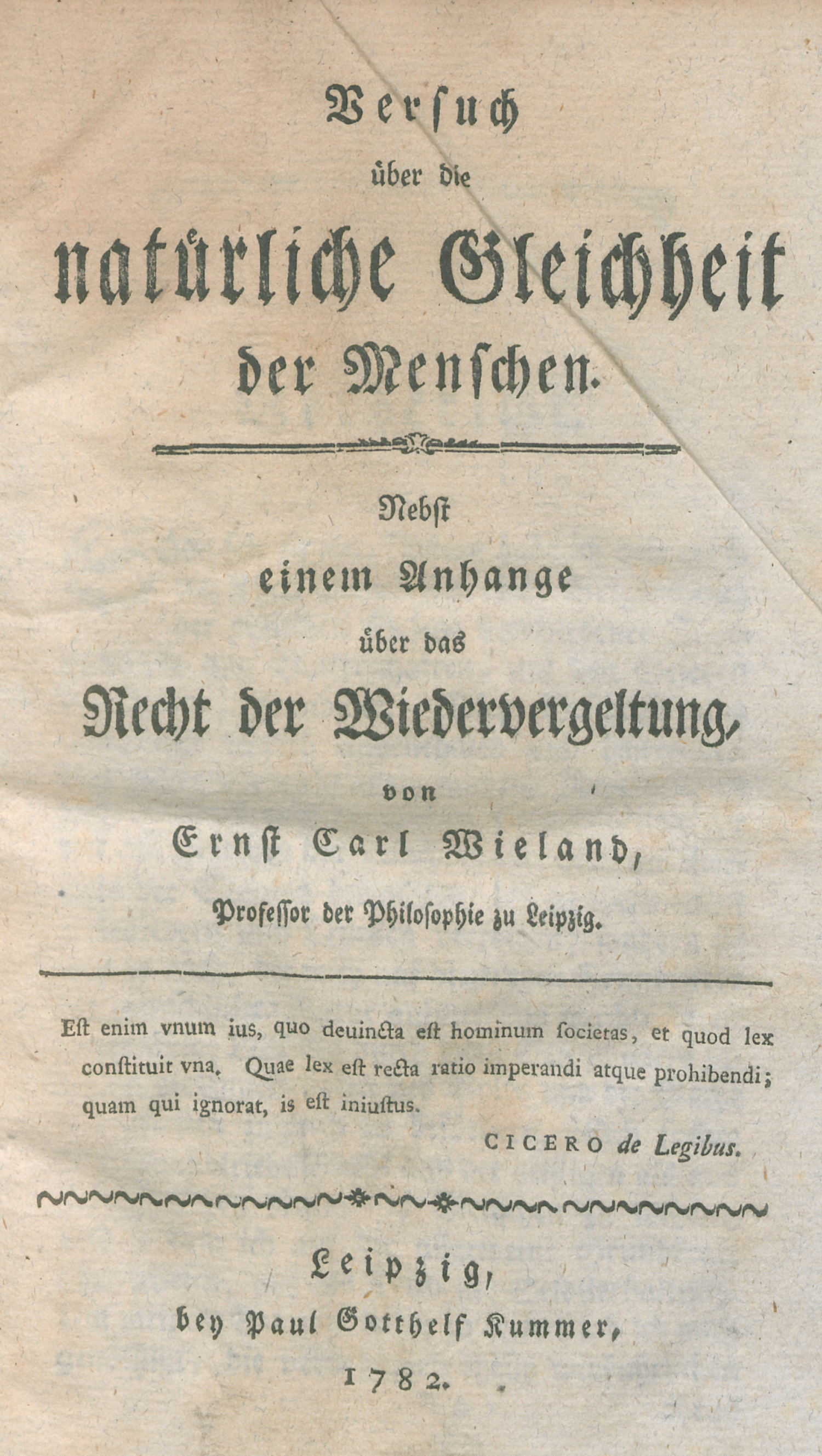 Wieland, Ernst Carl. Versuch über die natürliche Gleichheit der Menschen: Nebst einem Anhange über das Recht der Wiedervergeltung. 4 Bl., 135 S. 20 x 12 cm. Pappband aus dem 19. Jahrhundert (lichtrandig, berieben und bestoßen) mit goldgeprägtem RSchild. Leipzig, Paul Gotthelf Kummer, 1782.