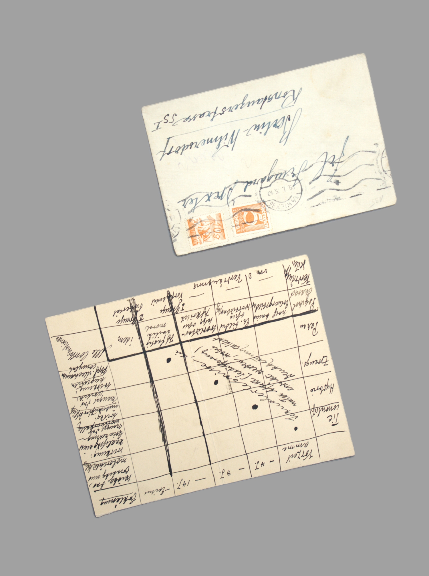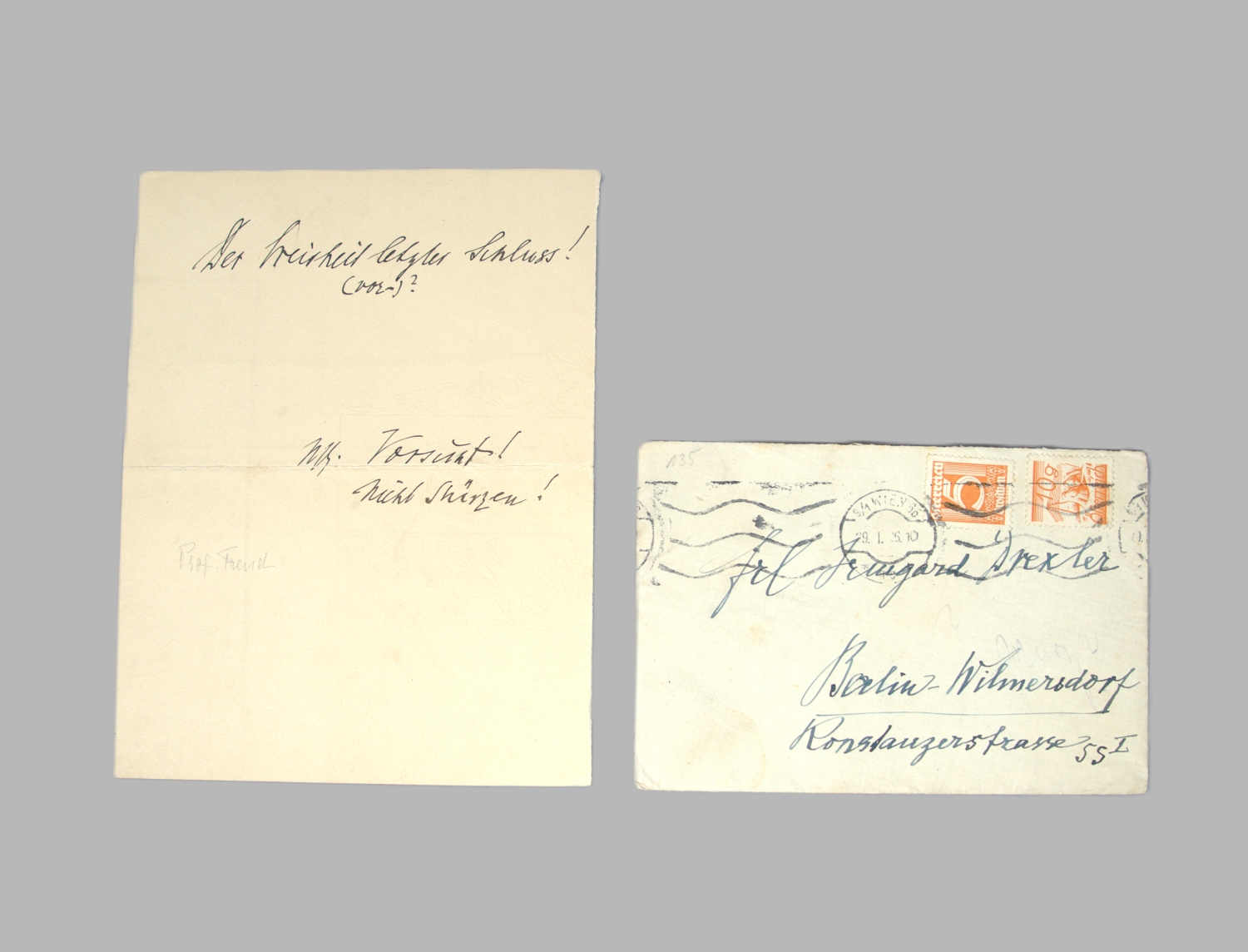 "Sexualerlebnisse, die unter Affekt (Sexdifferenz) erweckt werden, wobei Denkhemmung entsteht". Tabelle mit Freuds Eintragungen von menschlichen Altersstufen mit Zuordnung von Sexualverhalten und dessen Erklärung. Rückseitig 2 Notizen: "Der Freiheit letzter Schluss! (vor-)?". - "Vorsicht! Nicht stürzen!" - Beiliegend ein Briefumschlag, gestempelt Wien 29.I.1926 und adressiert an ein "Fräulein" in Berlin. Ob der Umschlag zu dieser Tabelle gehört, ist nicht ganz sicher.