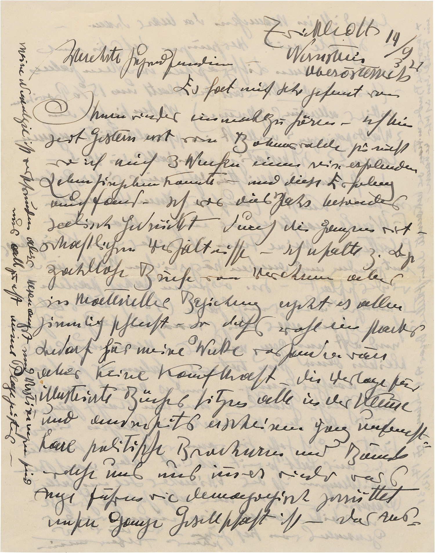Kubin, Alfred, österr. Zeichner, Graphiker und Schriftsteller, Meister des Unheimlichen und Phantastischen (1877-1959). 2 eigh. Briefe und 1 eigh. Postkarte m. U. "Alfred Kubin" bzw. "AK"22.VII.1935. Zus. 6 S. Gr. 4to und 8vo. Zwickledt (Wernstein) 1933-1935.