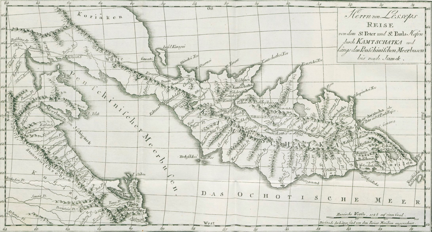 Das Magazin erschien bis 1839 mit Beschreibungen der Reisen u. a. von La Perouse, Phillip, Vancouver, Bligh und Le Vaillant. Herausgegeben von Johann Reinhold Forster u. a. Hier vorhanden die Berichte von Beniowski über Sibirien, Kamtschatka und Madagaskar (dazu die Tafeln). In Teil V die Übersetzung Forsters der "Reise durch Kamtschatka und Sibirien nach Frankreich" (Zwischentitel) von Lessep. – Exlibris auf dem Innenspiegel und Bibliotheksstempel auf dem Titel. Kaum fleckig.