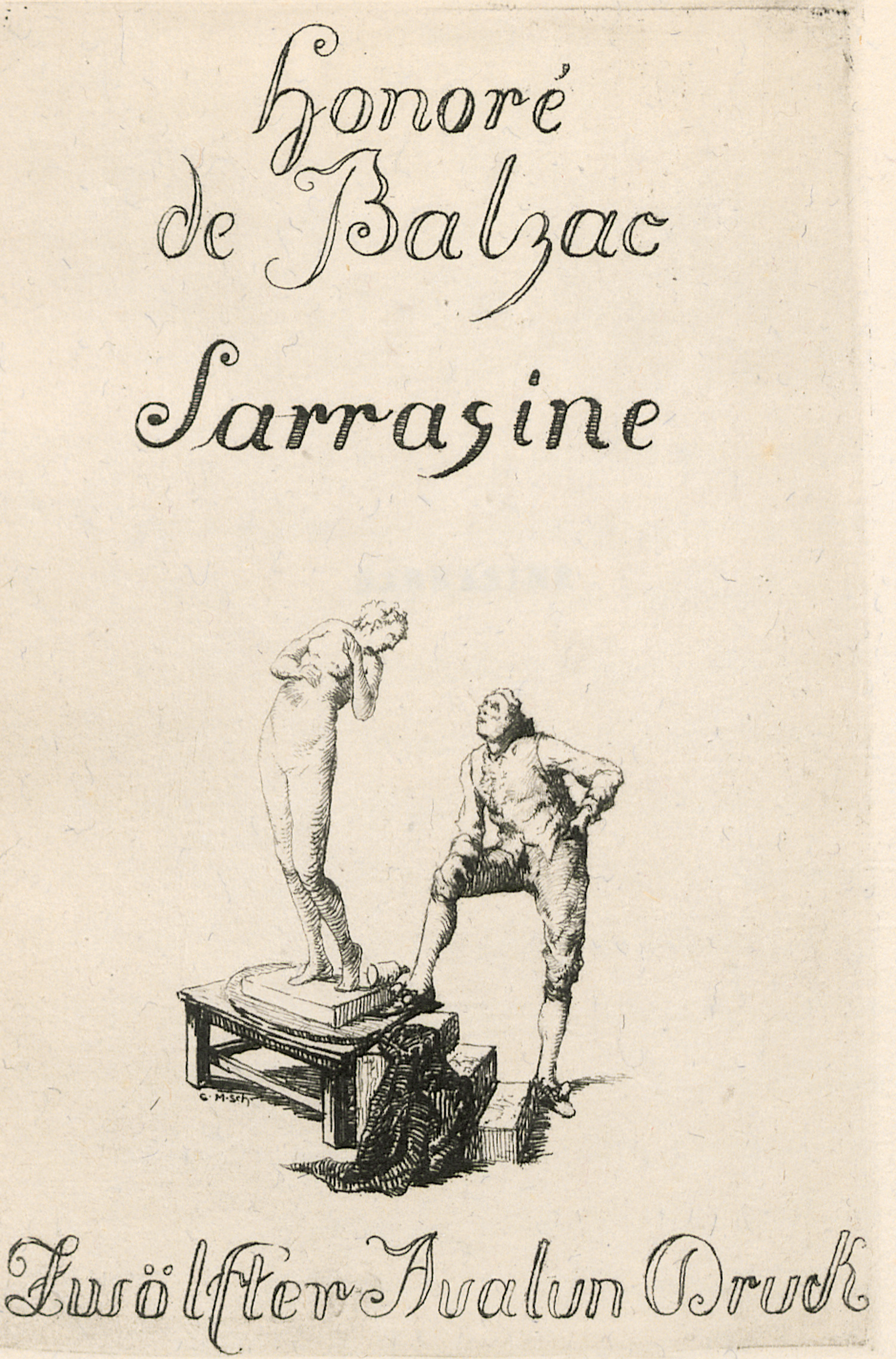 Balzac, Honoré de. Sarrasine. 90 S., 2 Bl. Mit 10 (8 blattgroßen) Orig.-Radierungen von Karl Max Schultheiß. 18,5 x 12,5 cm. OHalbleder (minimal berieben) mit RVergoldung, goldgeprägtem RSchild und KGoldschnitt. (Wien und Leipzig, Avalun, 1922).
