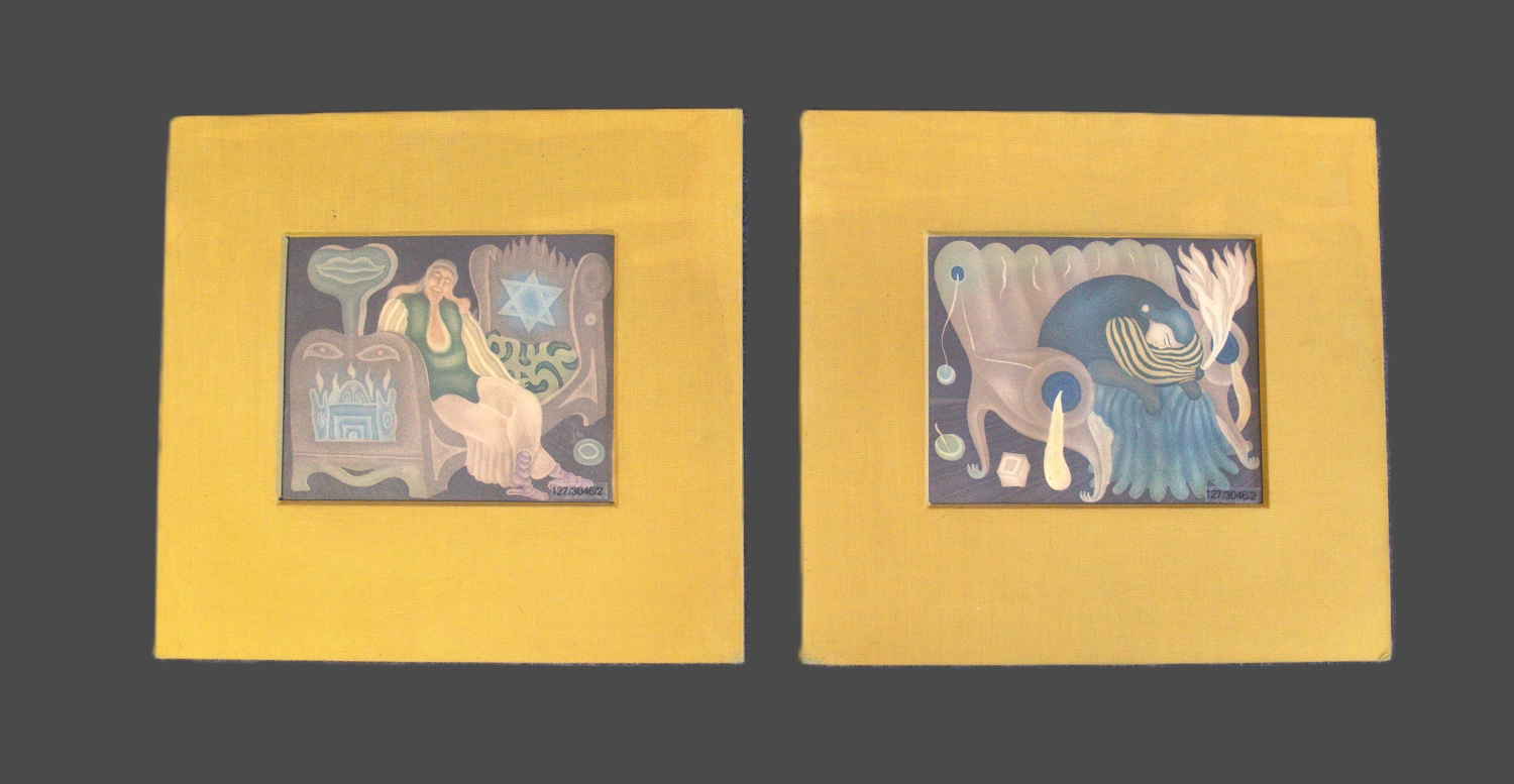 Brauer, Arik. "Das Ruhebett" (Le Lit) und "Der Schlaf" (Le Sommeil). 2 Blätter aus "XX Chassidische Erzählungen / XX Récits Hassidiques". Originale Farbradierungen. Ca. 20,5 x 25,5 cm. Unter Glas gerahmt in mächtige, leinenbezogene Holzrahmen (gering angestaubt, leicht bestoßen) 41,5 x 44 cm. (Frankfurt, Editeuropa & Galerie Sydow 1972-1973).