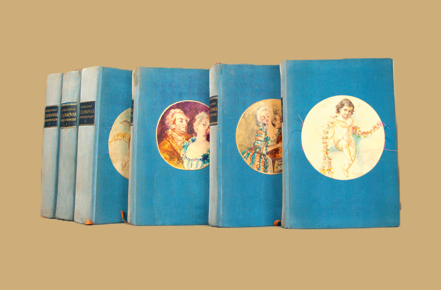 Casanova (de Seingalt), Giacomo. Die Erinnerungen. Vollständig übertragen von Heinrich Conrad. 6 Bde. Mit 56 eingebundenen Originalaquarellen des Monogrammisten H. K. 18,5 x 13 cm. Priv. Leinenbände d. Z. (teils etwas unfrisch und fleckig) mit mont. Originalaquarell auf Vorder- und Rückdeckel aller Bände, mit goldgepr. RSchildern und KGoldschnitt. Leipzig, H. Fikentscher, (1911).
