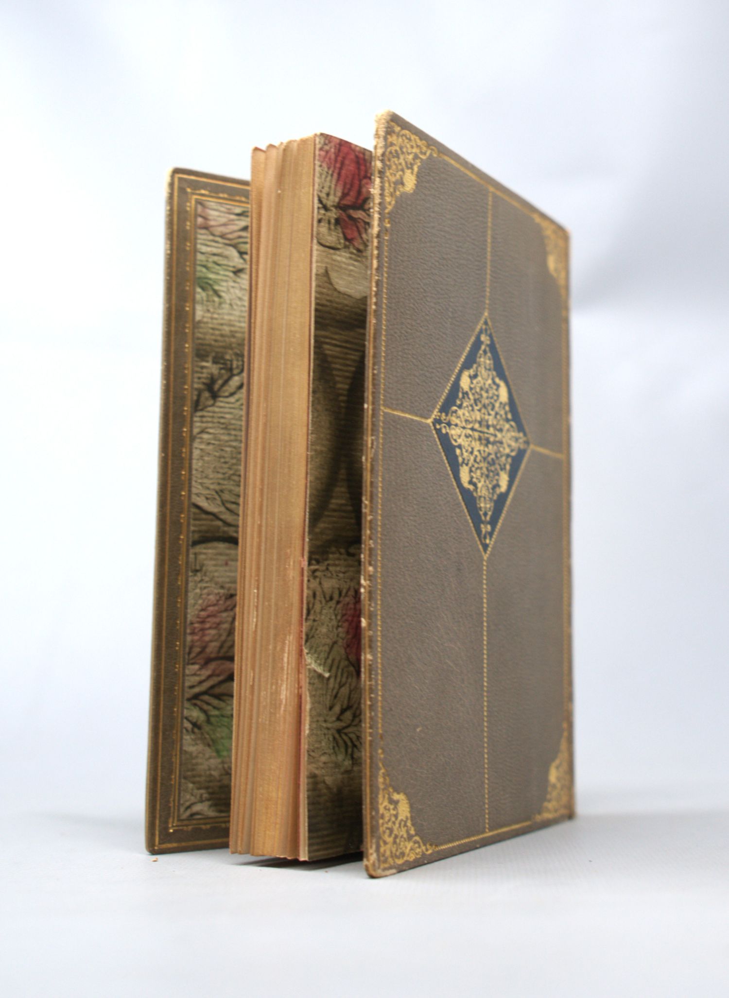 Dehmel, Richard. Der Mitmensch. Drama. 103 S. Mit 4 Skizzen. 19 x 13,5 cm. Grauer Maroquinband d. Z. mit reicher Goldprägung, intarsiertem Mittelstück, Eckfleurons und punktierter Linienvergoldung, Innenkantenvergoldung sowie Goldschnitt; Originalbroschurumschlag eingebunden. Berlin, H. Storm, 1895.