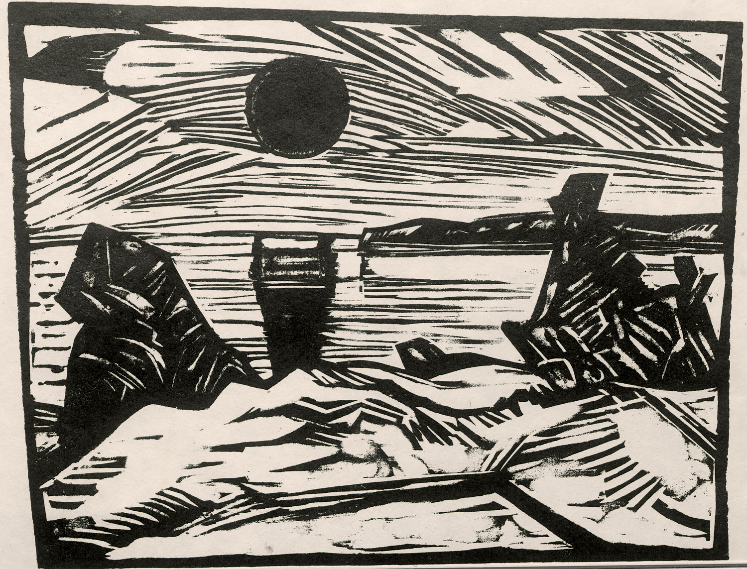 Dube 284 II b. Söhn V, 52002-3. – Expressiver Holzschnitt einer Uferszene mit feiner Lichtdramaturgie. Eine schwarze Sonnenscheibe erhebt sich am Himmel. Waagerechte Linien von Himmel und Wasser stehen in Kontrast zu den blockhaften Strukturen des Ufers.