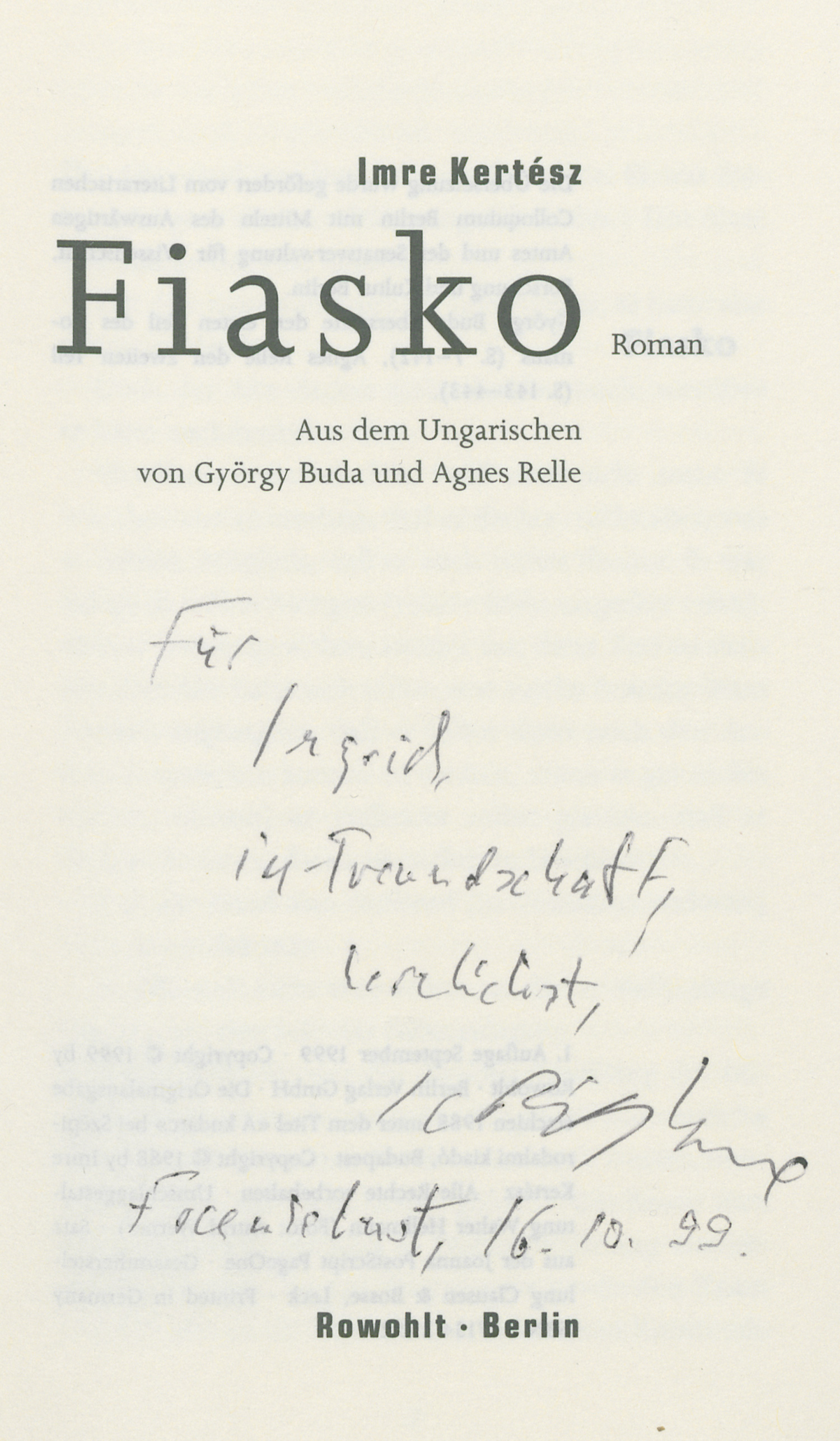 Kertész, Imre. Fiasko. Roman. Aus dem Ungarischen von György Buda und Agnes Relle. 20,5 x 11 cm. OPappband mit Schutzumschlag. Berlin, Rowohlt, 1999.