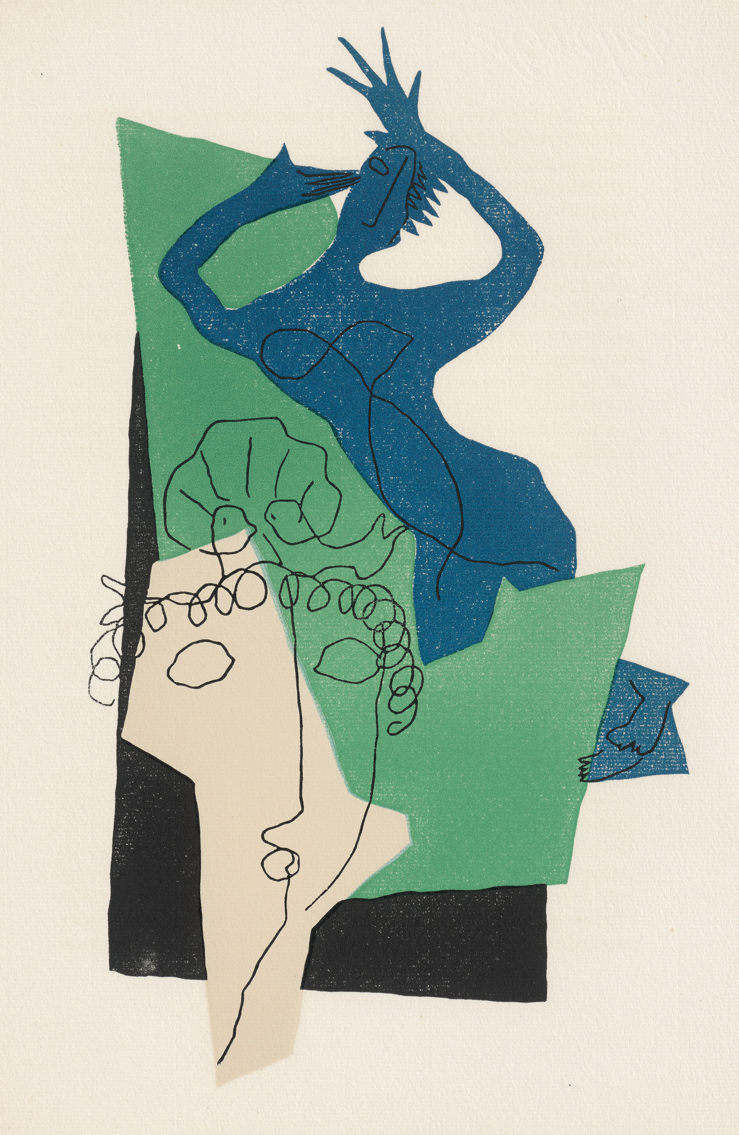 Laurens, Henri. - Lukian von Samosata (hier: Lucien). Dialogues. Übersetzt von Emile Chambry. 152 S., 2 Bl. Mit 24 Orig.-Farbholzschnitten auf Tafeln, 8 farbigen Orig.-Holzschnittvignetten und 1 doppelblattgr. farbigen Holzschnitt-Tafel (Tafelindex) von Henri Laurens. 39 x 29 cm. Lose Bogen in illustr. OUmschlag und OPappdecke (Gelenke angeplatzt). Paris, Tériade, (1951).