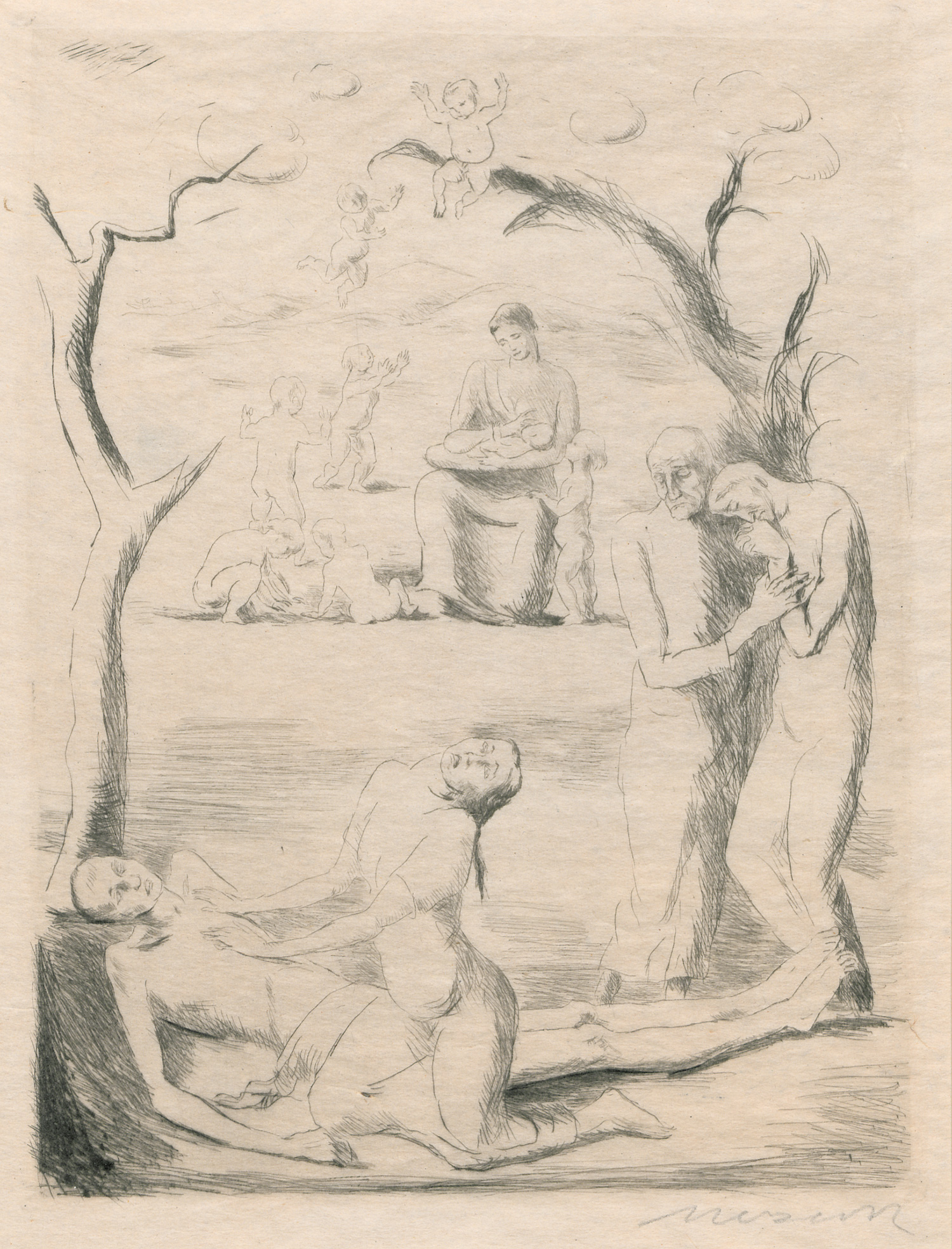 XXVI. Druck der Marées-Gesellschaft. Rodenberg 369, 26. – Eines von 65 Exemplaren der Handdrucke auf Japan, für die Subskribenten der Japan-Ausgabe (aus: Novalis. Heinrich von Ofterdingen, 9. Kapitel). Die Radierungen blattgroß, zwei Textvignetten gemeinsam mit einer szenischen Initiale unter einem Passepartout. – Unbeschnitten. Sehr gut erhalten.