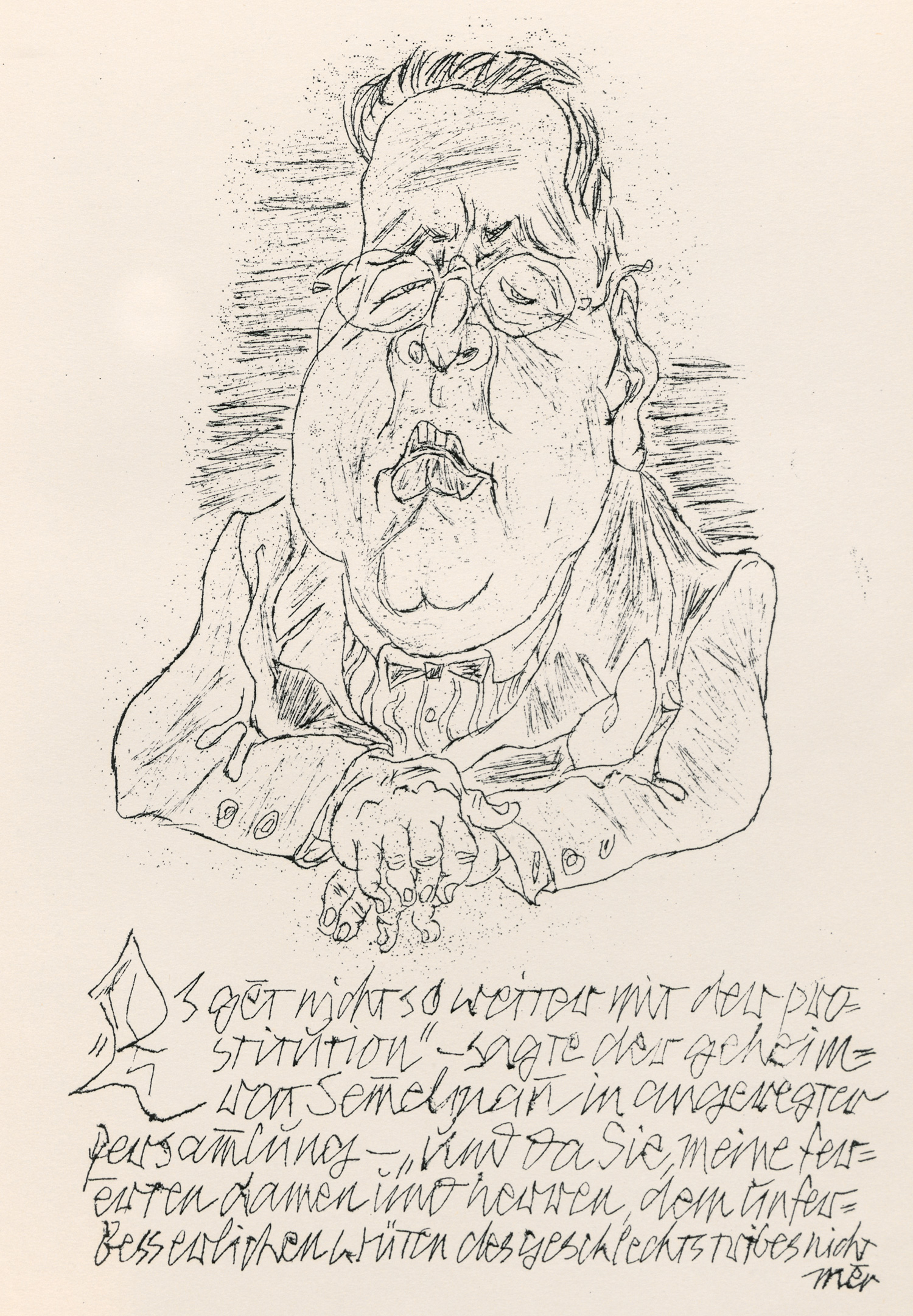 Pandora-Drucke 16. Nummeriertes Exemplar einer offenbar sehr kleinen Auflage (wohl 25 Exemplare). Druckvermerk vom Künstler signiert. Geistreiches Kuriosum, originell illustriert. Behandelt die Einrichtung eines "Bordells", ausgestattet mit künstlichen, nach berühmten Skulpturen gestalteten Puppen (Venus von Botticelli, Apollo von Belvedere), einem "variablen Spiegel" ("Die sexuelle Liebe - Ein Spiegelungsproblem") u. a. – Im Schnitt minimal stockfleckig, Blatt 6 mit kleinem Einriss. Gut erhalten.