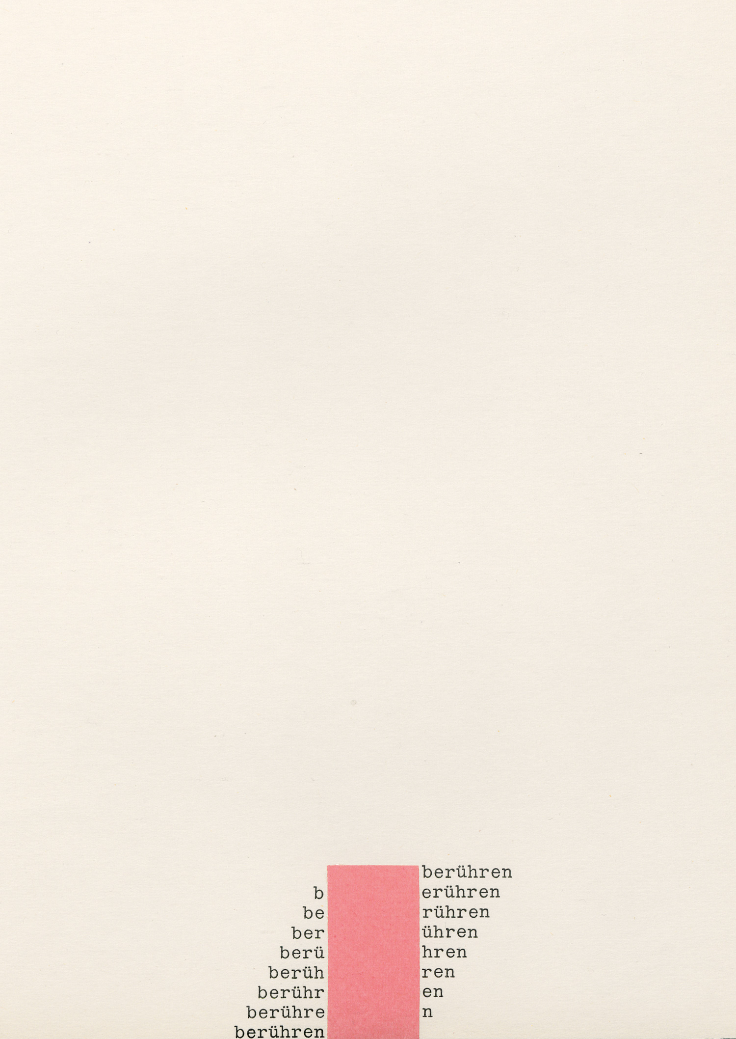 Gerhard Rühm (geb. 1930) zählt zu den wichtigen Vertretern der literarischen Avantgarde der fünfziger und sechziger Jahre. Seine frühen literarischen Arbeiten umfassen vor allem Lautgedichte (1952-1956), beeinflusst von zeitgenössischen experimentellen Strömungen wie dem in Wien rezipierten Tachismus. Parallel zur akustischen Dimension von Sprache richtet Rühm von Beginn an ein Augenmerk auf deren visuelle Ausdrucksmöglichkeiten. Seit 1954 entstanden Konstellationen und Ideogramme im typovisuellen Stil, wie er für die konkrete Poesie charakteristisch ist (vgl. KNLL).