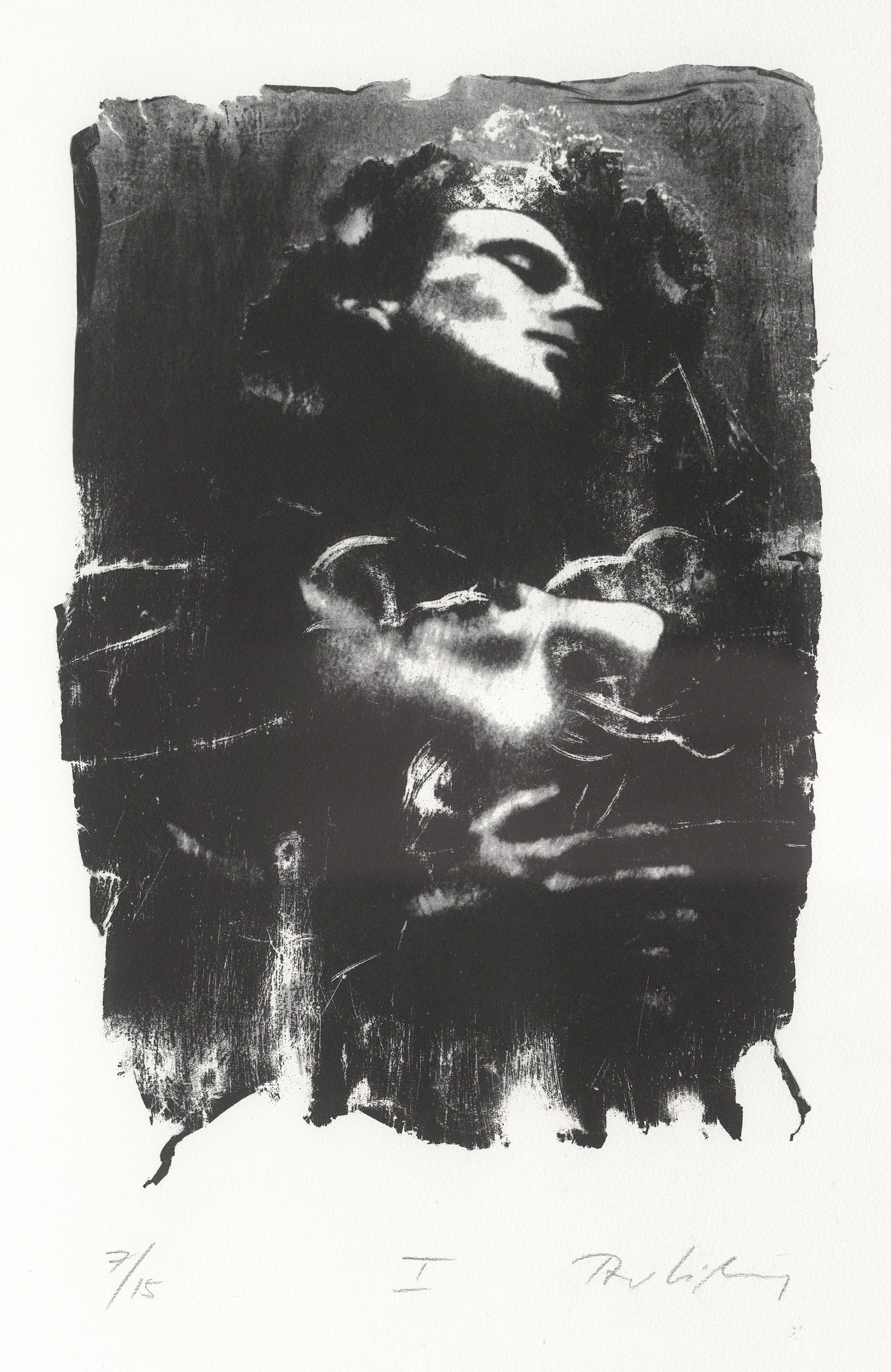 Wilms, Anno. Genet Fragmente. Grafikedition mit fünf Grafiken auf Vélin d'Arches. 2 Bl. Mit 5 signierten losen Lithographien. 65 x 50 cm. Schwarze OLeinenmappe (leicht berieben) mit montiertem DTitel. Heidelberg, Edition Signum Winfried Heid, (2000).
