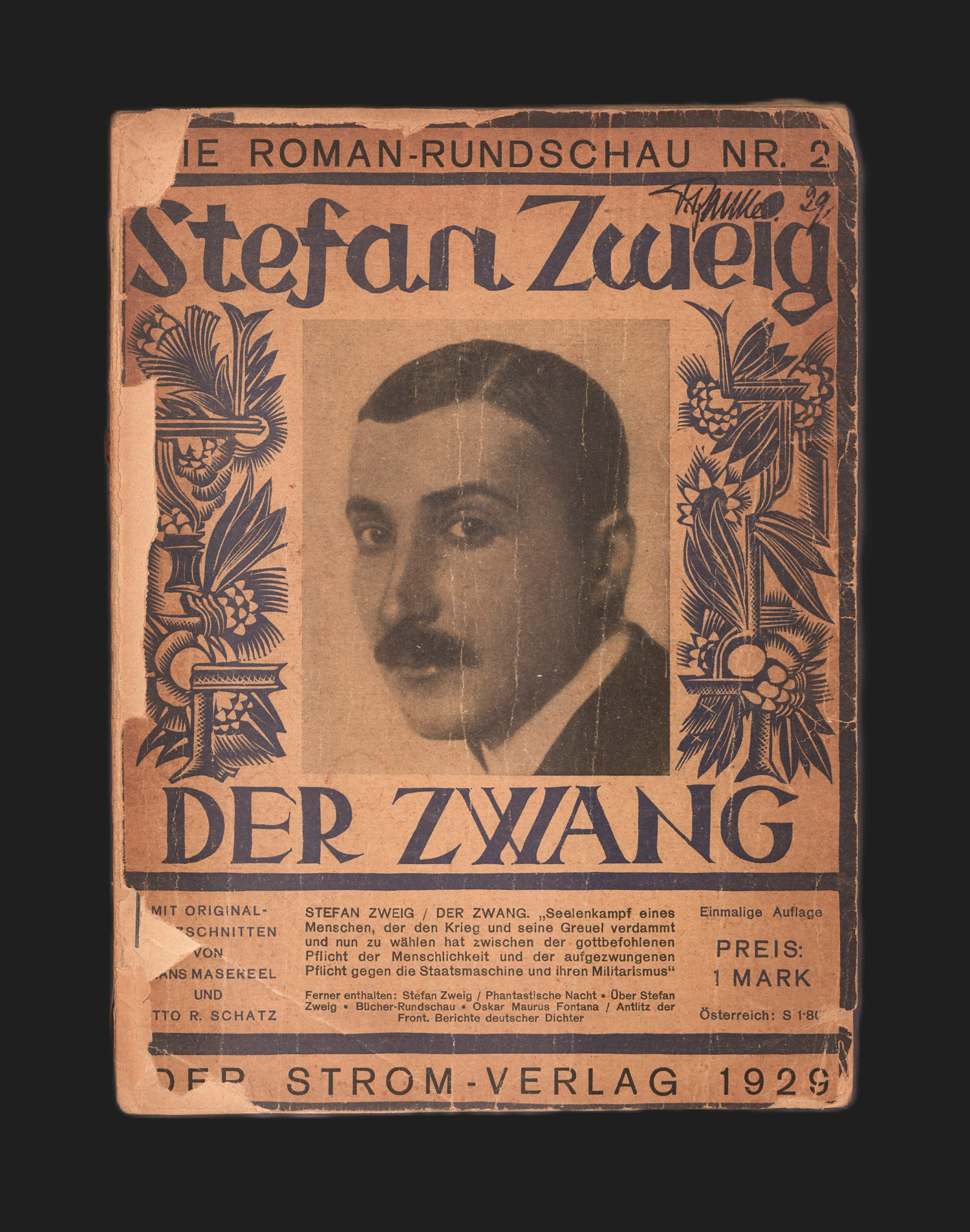 Zweig, Stefan. Der Zwang. Eine Novelle. - Phantastische Nacht. Eine Novelle. 126 S., 1 Bl. Mit Illustrationen von F. Masereel und Otto R. Schatz. 23,5 x 17 cm. Illustr. OBroschur (Vorderumschlag mit größeren Randläsuren und Besitzvermerk; Einband lose; Rücken brüchig). (Wien), Der Strom, 1929.