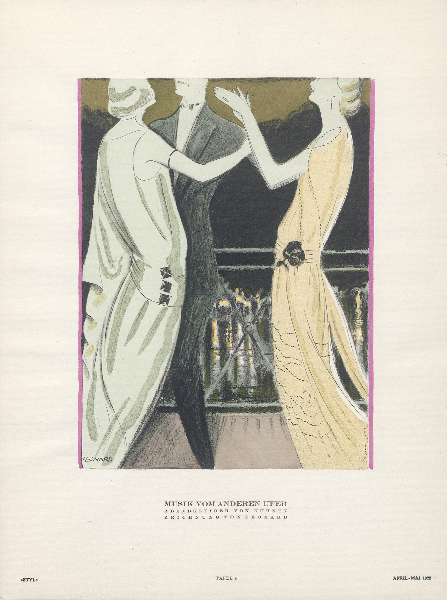 Styl. Blätter für Mode und die angenehmen Dinge des Lebens. Red. von R. L. Leonhard und L. Sternaux. Jg. I, Hefte 1-10 in 7 Heften. Mit 90 überwiegend kolorierten Tafeln und zahlreichen teils ebenfalls kolorierten Textabbildungen. 32 x 24 cm. Lose Blatt und Bogen in OUmschlägen (Heft I in OPergaminumschlag) in OKassette (etwas angestaubt und bestoßen). Berlin 1922.