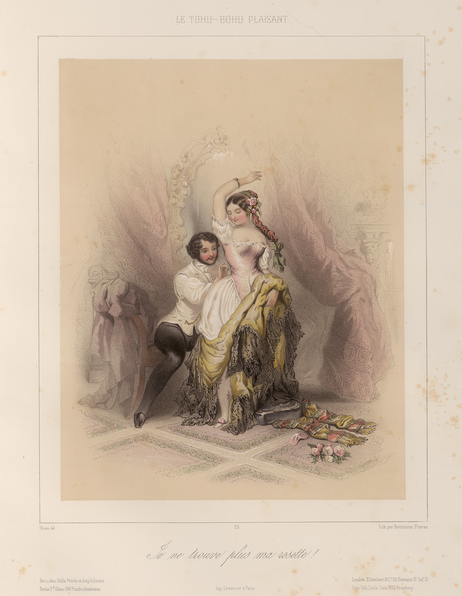 "Le Tohu-Bohu Plaisant" ist in institutionellen Beständen so gut wie nicht nachweisbar. Es gibt keine Exemplare in OCLC, BnF, CCFr oder Standardbibliografien (Gumuchian, Cohen-De Ricci usw.). Die erhaltenen Exemplare scheinen sich in der Anzahl der Tafeln und ihrer Zusammensetzung zu unterscheiden, was auf einen unregelmäßigen oder nicht standardisierten Herausgabeprozess hindeutet. – Das feste, weiße Lithographiepapier ist papierbedingt teilweise etwas sprenkelfleckig, die Darstellungen sind jedoch nur ausnahmsweise betroffen, sie sind in bemerkenswert nuancierter Farbigkeit handkoloriert auf bestem Druck. Kein vollständiges Exemplar in der Bibliothèque Nationale in Paris.