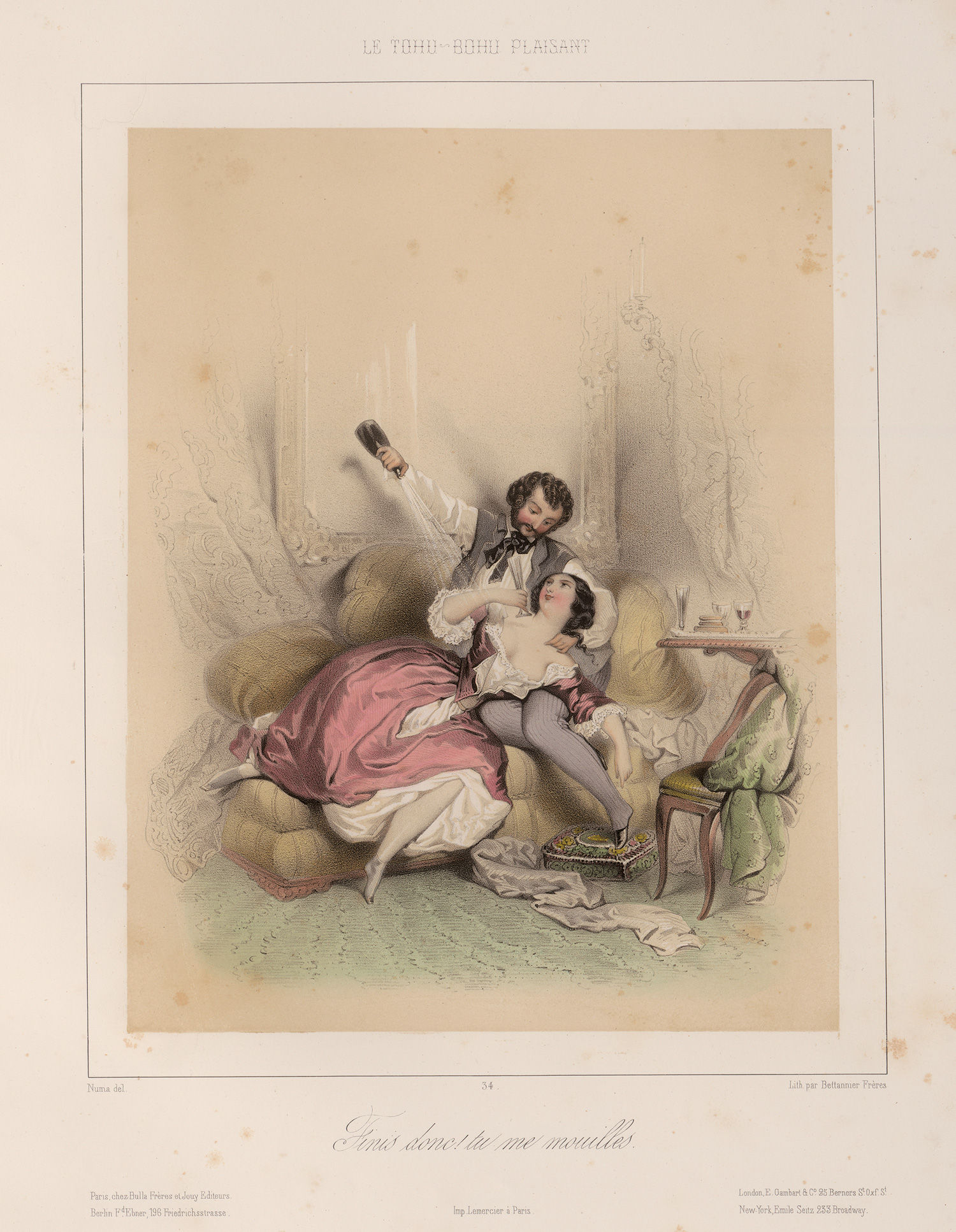 Überaus seltenes Meisterwerk der französischen Lithografiekunst zwischen Humorismus, Erotik und Genredarstellungen aus der Mitte des 19. Jahrhunderts, herausgegeben von der produktiven Firma Bulla Frères, die die Lithographien nach Entwürfen von Pierre-Numa Bassaget, Pierre Jean de Beranger und Frank Teichel in der lithographischen Anstalt von Bettannier Frères in Paris auf den Stein bringen ließ, um sie dann unter der Verwendung von Tonplatten-Unterdruck fein kolorieren und teils mit Eiweiß höhen zu lassen.