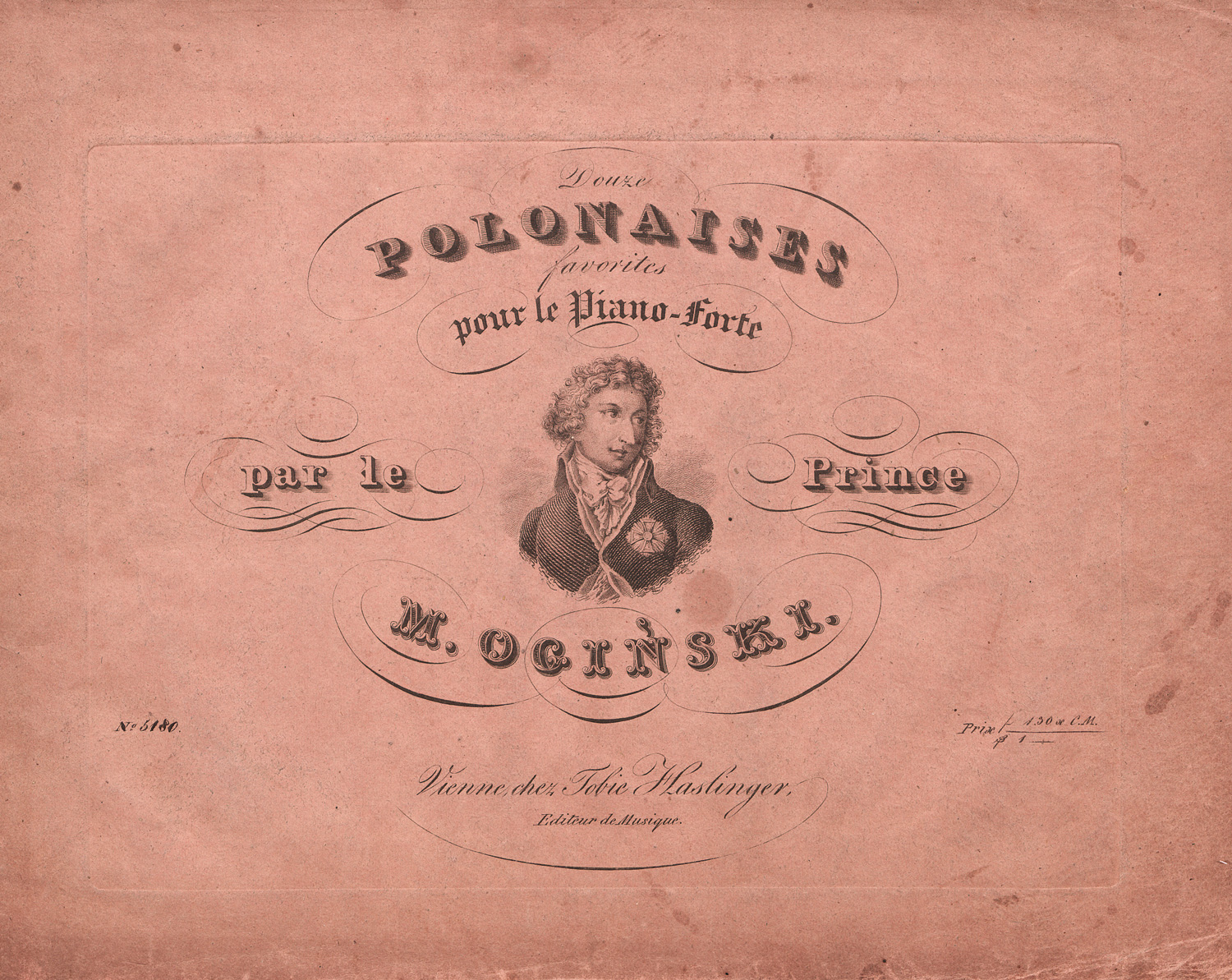 Oginski, Michal Kleofas. Douze Polonaises favorites pour le piano-forte. 27 gestoch. S. Musiknoten. Mit gestoch. TVignette. 25,5 x 32,5 cm. Illustr. (wiederh. gest. Titel) OBroschur (fleckig; stärkere Alters- und Gebrauchsspuren). Wien, Haslinger, (um 1828).