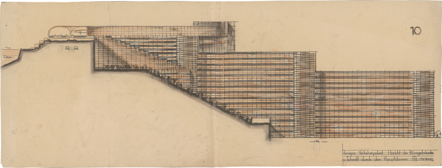 Entwurf II "Panropa Verkehrspalast Ansicht der Bürogebäude u. Schnitt durch den Hauptdamm M. 1:1000 Skizze" zeigt die landseitige Hauptfassade des gewaltig großen Verkehrspalastes von Süden, der für die Distribution des Autoverkehrs zwischen Europa und Afrika errichtet werden sollte. Links erhebt sich das Gelände aus dem Atlantik über große Stufen zu zwei monumentalen Hallengebäuden, den "Bahnhöfen" mit der "Dampferanlegestelle", "Landungsstegen", "Bahnsteigen" mit Untertunnelungen für Eisenbahnen, aber vor allem breiten Autobahntrassen, auf denen der Fernverkehr "Gibraltar-Marokko" zusammenlaufen sollte. Der Aufriss zeigt gut die Hanglage mit dem insgesamt 36- bis über 60-stöckigen Palast, auf dem oben ein Flugzeug-Landeplatz und ein Mast zum Anlegen für Luftschiffe errichtet werden sollte. – Bildträger etwas gebräunt, wenige Fleckchen, Farbwischer und Gebrauchsspuren.