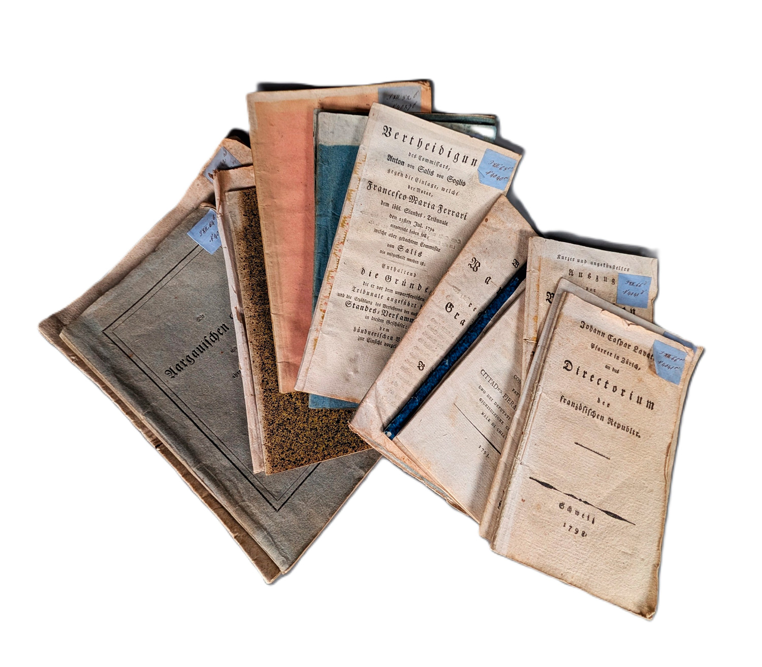 Vorhanden sind: I. Bundes-Brief des Freistaats der drei Bünde, in Rhäzien als die Haupturkunde dessen Verbindungen. 16 S. Chur, Johann Pfeffer, 1790. - II. Kurzer und ungekünstelter Auszug der Beschwerden der Unterthanen, und darüber von der löblichen Standeskomission im Hornung 1790 gegebenen Auskunft und entworfenen Dekrets. 62 S. 1790. - III. Bericht an die Schweizer betreffend ihre Lage in Rücksicht auf ihre Verbindung mit dem König von Frankreich. 27 S. 1792. - IV. Memoriale presentato da Alcuni zelanti patrizij nel consiglio generale tenutosi in Chiavenna. 22 S., 1793. - V.Salis-Solio, Anton von. Vertheidigung des Hrn. Commissars Anton von Salis-Soglio gegen dieEinlage, welche der Notar, Francesco Maria Ferrari dem löbl. Standes-Tribunale den 23.sten Jul. 1794 eingereicht haben soll ... 1794. - VI. Baron von Cronthal. Gerechte Beschwerde über die vielfältigen Uebertrettungen des allgemeinen Bundsbriefs, der Erdeinigung, desewigen Friedens, Capitulate und Tracteten, und Kränkungen der Rechte der Herrschaft Razins ... 51 S. 1795. - VII. Ein Wort der Warnung an alle rechtschafne Graubündtner über den Bruch der Bündnisses mit lobl. Stand Zürich. O. J. (1796). - VIII. Johann Caspar Lavater, Pfarrer in Zürich, an das Directorium der französischen Republik. 32 S. Schweiz 1798. - IX. Ansprüche und Hoffnungen der Stadt Trier, bei Gelegenheit der Organisation des königl. preussischen Großherzogthums Nieder-Rhein. 20 S. Trier, Heßrodt, 1815. - X. Actenstücke, die am 12. und 20. März 1822 zu Kreuznach stattgehabten Verhaftungen betreffend. Zweite Lieferung. VI, Seite 29-72. Koblenz, Heriot, 1822. - XII. F. C. Grimmel. Etwas über J. P. Klingenschmidt, gestorben zu Kreuznach am 28. März 1822. 1 Bl., 20 S. Koblenz, B. Heriot, 1822. - XIII. Johann Heinrich Kaufmann. Denkschrift bei der freudigen Heimkehr der Herren C. Eberts und W. Schneegans, Superintendenten der evangelischen Gemeinde von Kreuznach. 22 S., 1 Bl. Mainz, Florian Kupferberg, 1822. - XIV. Ludwig Christian Kehr. Denkschrift bei der freudigen Heimkehr des Herrn Dr. Carl Grimmel und des Herrn Notar Born. 24 S. Mainz, Florian Kupferberg, 1822. - XV. Der Verfassungsrath des Kantons St. Gallen und der Fürst-Bischof von St. Gallen. 16 S. St. Gallen, Wegelin und Wartmann, 1831. - XVI. Die Aargausichen Klöster und ihre Ankläger. Auszug aus der Denkschrift. 100 S. Schaffhausen, Hurter, 1841.