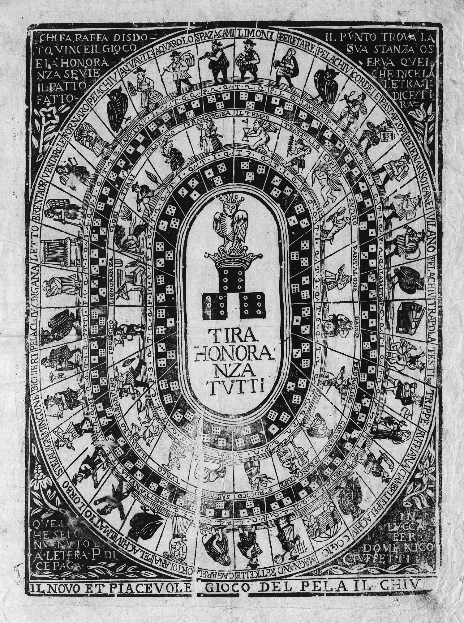 Das vorliegende Spielbrett ist ein einfaches Würfelspiel, bei dem Spieler basierend auf den Würfen von drei sechsseitigen Würfeln Einsätze in einen Topf zahlen oder daraus nehmen. Es ist unter den Namen "Pela il chiu" oder "Plume le hibou" bekannt. Dieses Spiel wurde in Italien in den 1580er Jahren populär und kam im 17. Jahrhundert unter dem Namen "Jeu de la Chouette" oder "À qui plumera son compagnon" nach Frankreich. Das Spielbrett besteht aus vier konzentrischen Ovalen mit Feldern, auf denen Würfel, Figuren (ein Blinder, eine Zigeunerin, ein Amor, ein Satyr aus der griechischen Mythologie, der Gott Bacchus, ein Pedrolino, ein Francatripe aus der Commedia dell'arte, ein Türke, ein Barbar, etc.), Berufe, Gegenstände (Vogelfalle) oder Eulen zu sehen sind. – Mit Mittelfalz, fleckig, knickspurig, mit Randläsuren und kleinen Fehlstellen. Selten. Dekorativ.