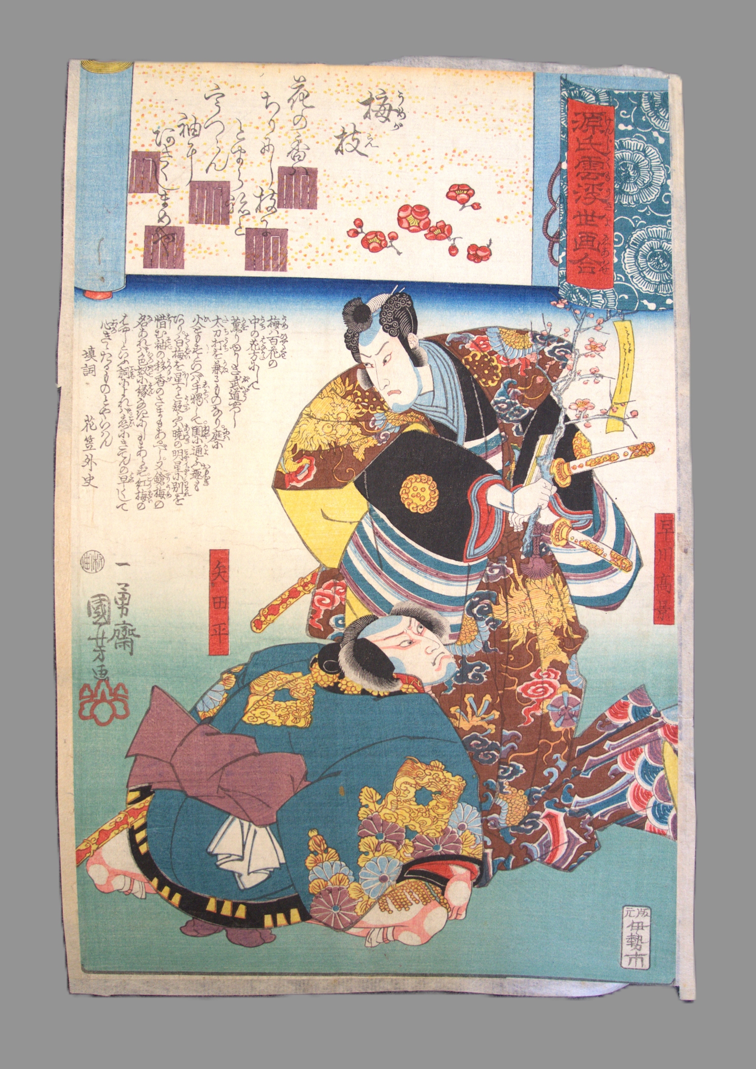 Supplementblatt Nr. 4: Norinoshi (Lehrer der Riten). Szene: Der Schauspieler Ichikawa Danjûrô VIII als Oniwaka Maru überwältigt einen Mann, der versucht hatte, ihn mit einem Seil zu binden. – Überwiegend mit kleinen Wurmspuren, winzigen Löchern und leichten Randschäden. Viele Blätter sind auf Japanpapier oder festeren Karton verso hinterlegt und aufgezogen. Vereinzelt gebräunt und mit Falzspuren.