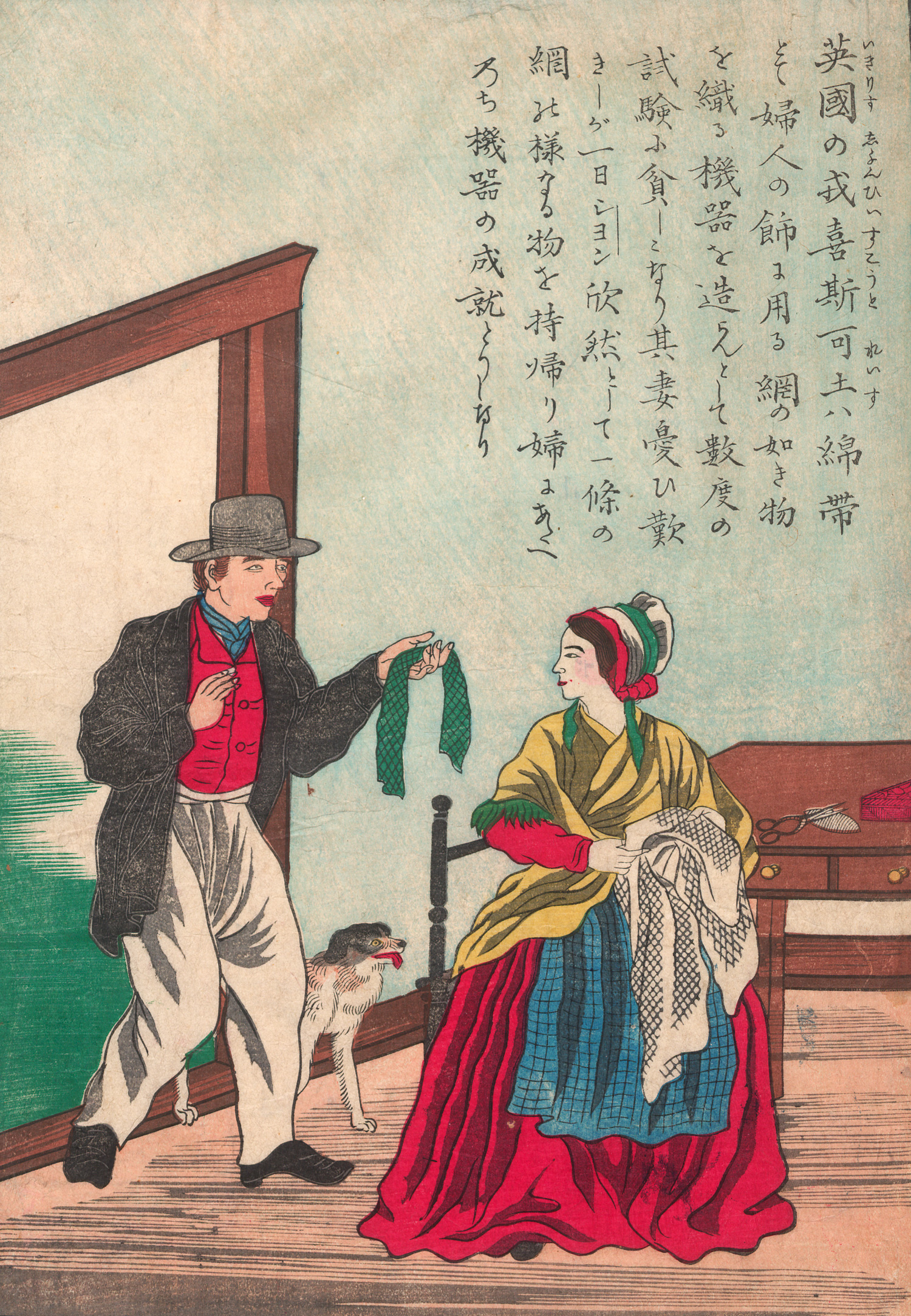 Die Darstellung zeigt den englischen Erfinder John Heathcoat (1783-1861) im Gehrock und Zylinder, wie er seiner sitzenden Frau in einem Interieur ein grünes Band, das Erzeugnis seiner neu erfundenen Maschine, der Nähmaschine, präsentiert. Im Hintergrund ist ein kleiner Hund zu sehen. Oben erläuternder Text in Kanji. – Im unteren weißen Rand sehr winziger Randeinriss. Papierbedingt nur leicht gebräunt, insgesamt sehr gut erhalten und farbfrisch.