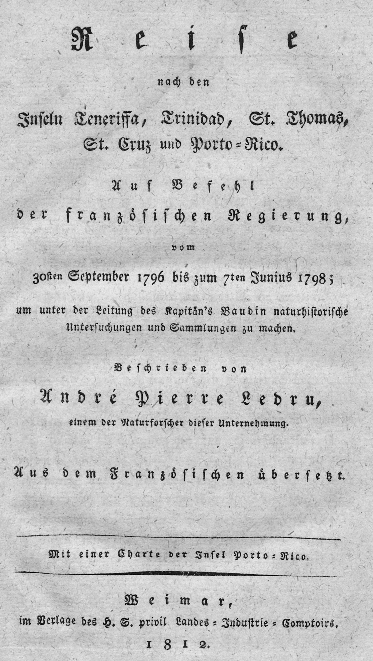 Ledru, André Pierre. Reise nach den Inseln Teneriffa, Trinidad, St. Thomas, St. Cruz und Porto-Rico vom 30sten September bis zum 7ten Junius 1798. Aus dem französischen Übersetzt. XX, 324 S. Mit gefalteter Kupferkarte. 19,5 x 11 cm. Moderne Broschur. Weimar, Landes-Industrie-Comptoirs, 1812.