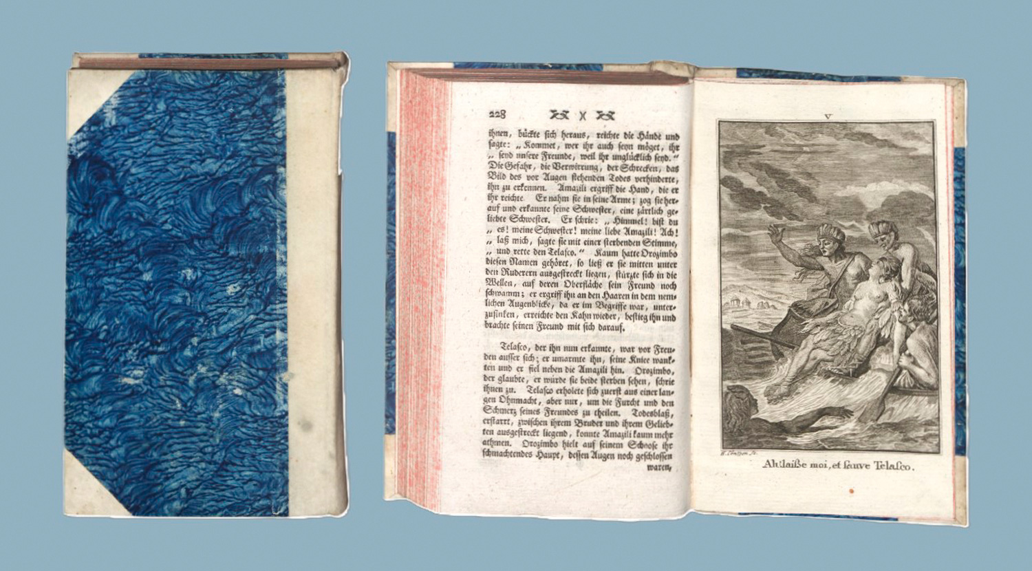 Marmontel, (Jean François). Die Incas oder die Zerstörung des Reiches von Peru aus dem Französischen übersetzt (von Johann Joachim Christoph Bode). 2 Bände. 14 Bl., 232 S., 2 Bl.; 1 Bl., 296 S., 3 Bl. Mit gestochenem Frontispiz und 10 Kupfertafeln. 17 x 10,5 cm. Neuere Halbpergamentbände (leicht fleckig) mit RSchild. Frankfurt und Leipzig 1777.