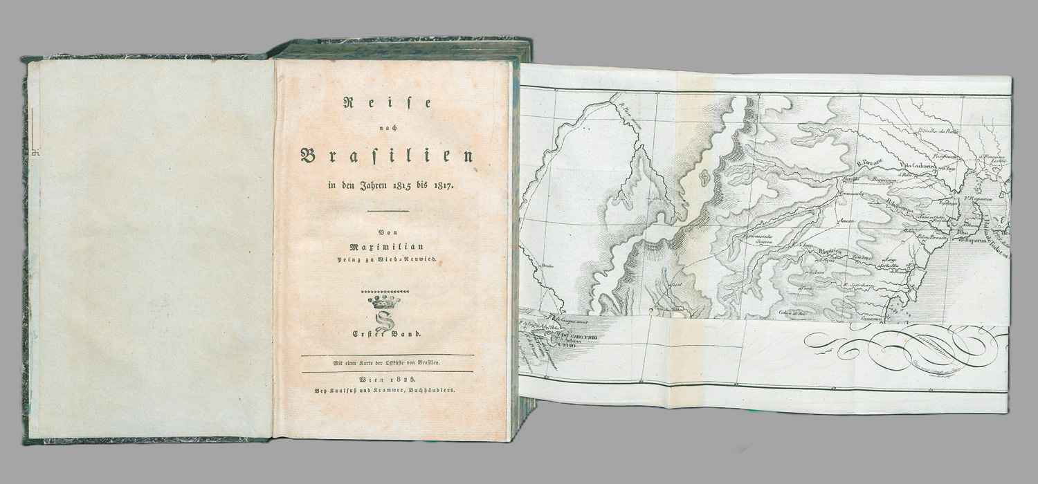 Borba de Moraes II, 545/546. Sabin 47018. Bosch 321. – Eindrucksvolle Drucke zur Brasilien-Reise des Prinzen Maximilian zu Wied-Neuwied (1782-1867) im Jahre 1815 bis 1817. Der Prinz trug als deutscher Forschungsreisender und Naturforscher maßgeblich zur zoologischen und ethnologischen Erforschung Amerikas bei. Vorhanden sind: "Puros in ihrer Hütte", "Gruppe einiger Camacans im Walde", "Zusammenkunft mit Capitam Bento Lourenzo und seinen Mineiros in den Urwäldern am Mucuri" und "Zierrathen und Gerätschaften der Camacaris". Mit der meist fehlenden Karten, "Ostküste von Brasilien zwischen dem 12. und 25. Grad ..." von Aichinger nach Arrow Smith lithographiert. Sowie mit der Karte "Carte der Neuen Straße von Villa de St. Jose do Porto Alegre nach Minas Novas ...". – Etwas stock- und braunfleckig. Vorsatz mit einem Katalogschild "Kasten III., Buchstaben W., Nr. 22".