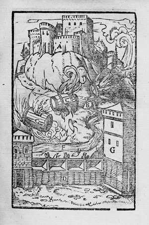 Die feinen Holzschnitte zeigen eine doppelblattgroße Karte von Frankreich und Spanien sowie Militäranlagen, Befestigungen, Belagerungstürme, Burgen und Festungen, die allerdings sehr spätmittelalterlich und weniger antik anmuten. Höchst interessant ist die Tafel mit der Wehr durch brennende, mit explosivem Zunder gefüllte Weinfässer, die zur Verteidigung der Burg den Hang herabgeworfen werden. – Ohne den vorderen Vorsatz, Titel mit 3 Ausschnitten (Textverlust nur verso), 2 älteren hs. Besitzvermerken, u. a. "Joannes Fridericus Gullmann 1779" sowie gestempelt. Etwas gebäunt, fleckig, sonst im Block meist sehr sauber und frisch. Bemerkenswert schön gebunden mit großem blindgeprägten Porträt-Medaillon auf dem VDeckel "Effigies MDLXXVIII Nicolai Reisneri Leorini Juriscos aeta(tis) XXXIII", umgeben von Putten, einem kleinen Löwenwappen, Rückdeckel mit reichem Renaissance-Bandelwerk.