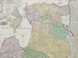 Karte des Baltikums mit Darstellung der Herzogtümer Livland und Kurland. Mit Teilen des heutigen Estlands und Lettlands sowie den angrenzenden Inseln, darunter Ösel (Saaremaa) und Dagö (Hiiumaa). Im Norden der Finnische Meerbusen, Darstellung der Ostseeküste. Aus Homanns Atlas Novus Terrarum Orbis Imperia. – Leicht gebräunt und wasserrandig. Bugfalte verstärkt.