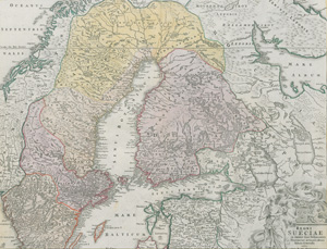 Darstellung von Schweden und Finnland. Mit angrenzenden Gebieten von Norwegen, Estland, Lettland und Russland. Unten rechts die prächtige Titelkartusche mit Meilenanzeiger. – Etwas fleckig im Rand und bestaubt, Bugfalte unterlegt. Verso gestempelt sowie mit Sepiamarginalie von alter Hand.