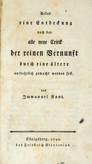 Ueber eine Entdeckung der alle neue Critik der reinen Vernunft entbehrlich gemacht werden soll. Königsberg, F. Nicolovius, 1790. - Seltene erste Ausgabe