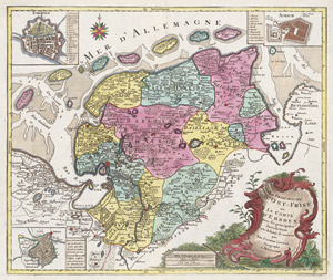 Lotter, Tobias Conrad. La Principauté d'Ost-Frise, ou Le Comté d'Embden avec ses principales Jurisdictions. Kolorierte Kupferstichkarte. 49,5 x 58,5 cm. Augsburg, Georg F. Lotter, um 1760.